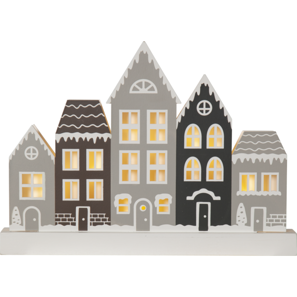 Dekorativ adventsljusstake i laserskuret trä med 5 hus på rad och led belysning. Den passar lika bra i vardagsrummet som i barnrummet, i en hylla eller på en skänk. 6 små ledlampor lyser upp motivet och ger en stämningsfull känsla. Produkten drivs av 2 st AA batterier ( ingår ej ) och har timerfunktion. 6 h på, 18 h av. Repeterande.