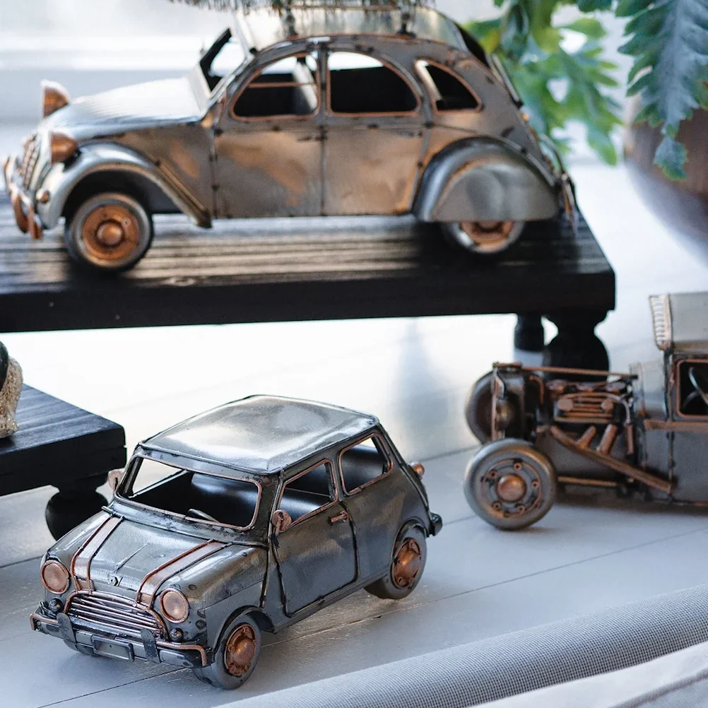 Charmig dekoration i form av en bil i silver metallic. Denna dekorativa bilmodell i vintagestil är handgjord i metall och har en industriell, väderbiten finish med kopparfärgade detaljer.