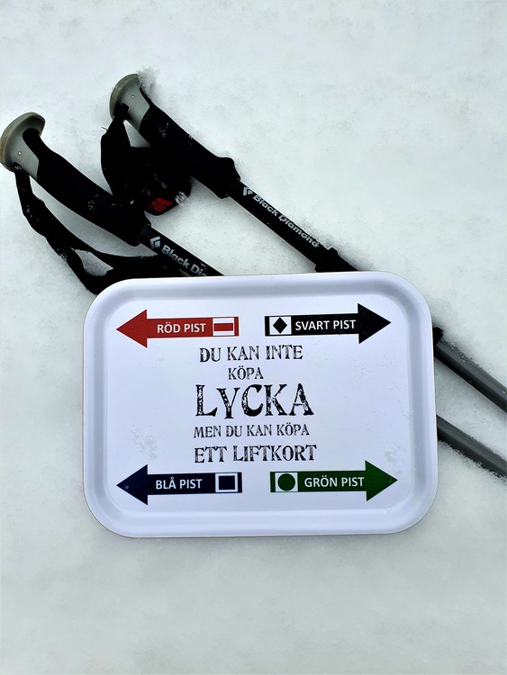 Vit bricka tillverkad i björkfanér med texten “Du kan inte köpa lycka men du kan köpa ett liftkort”.