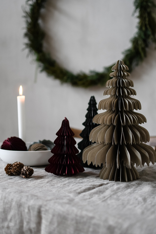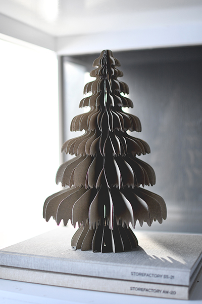 Mysig juldekoration i form av en pappersgran i beige.
