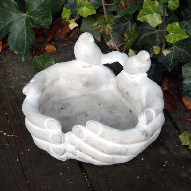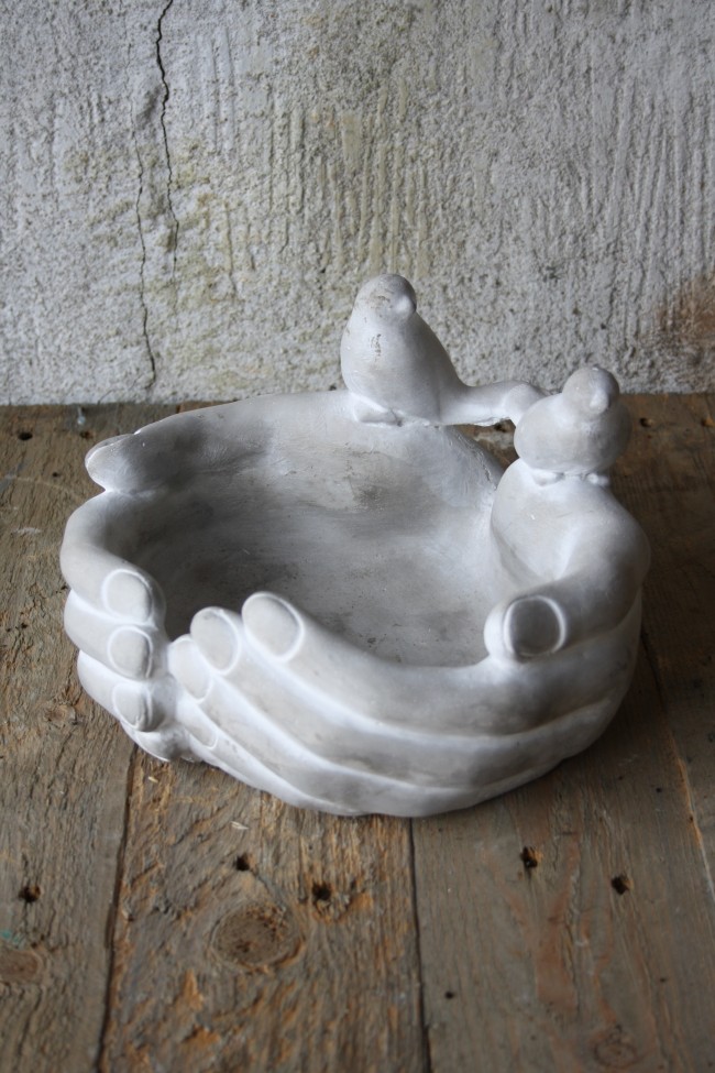 Ett dekorativt fågelbad med formen av ett löv i mörkbrunt järn. Söt fågel på kanten.
