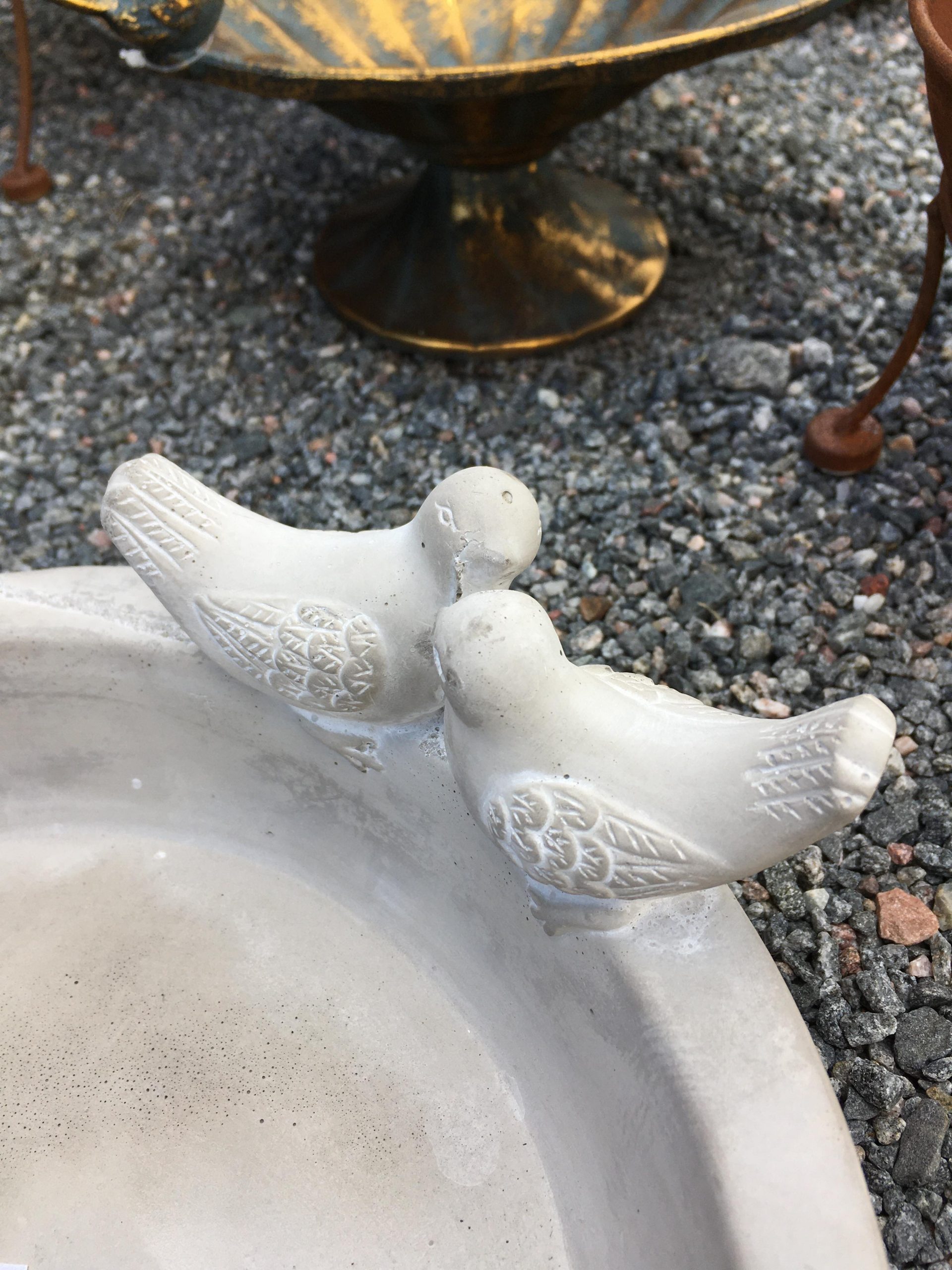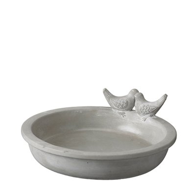 Vackert fågelbad i grå betong med dekorativa fåglar på kanten. Ej frosttåligt.