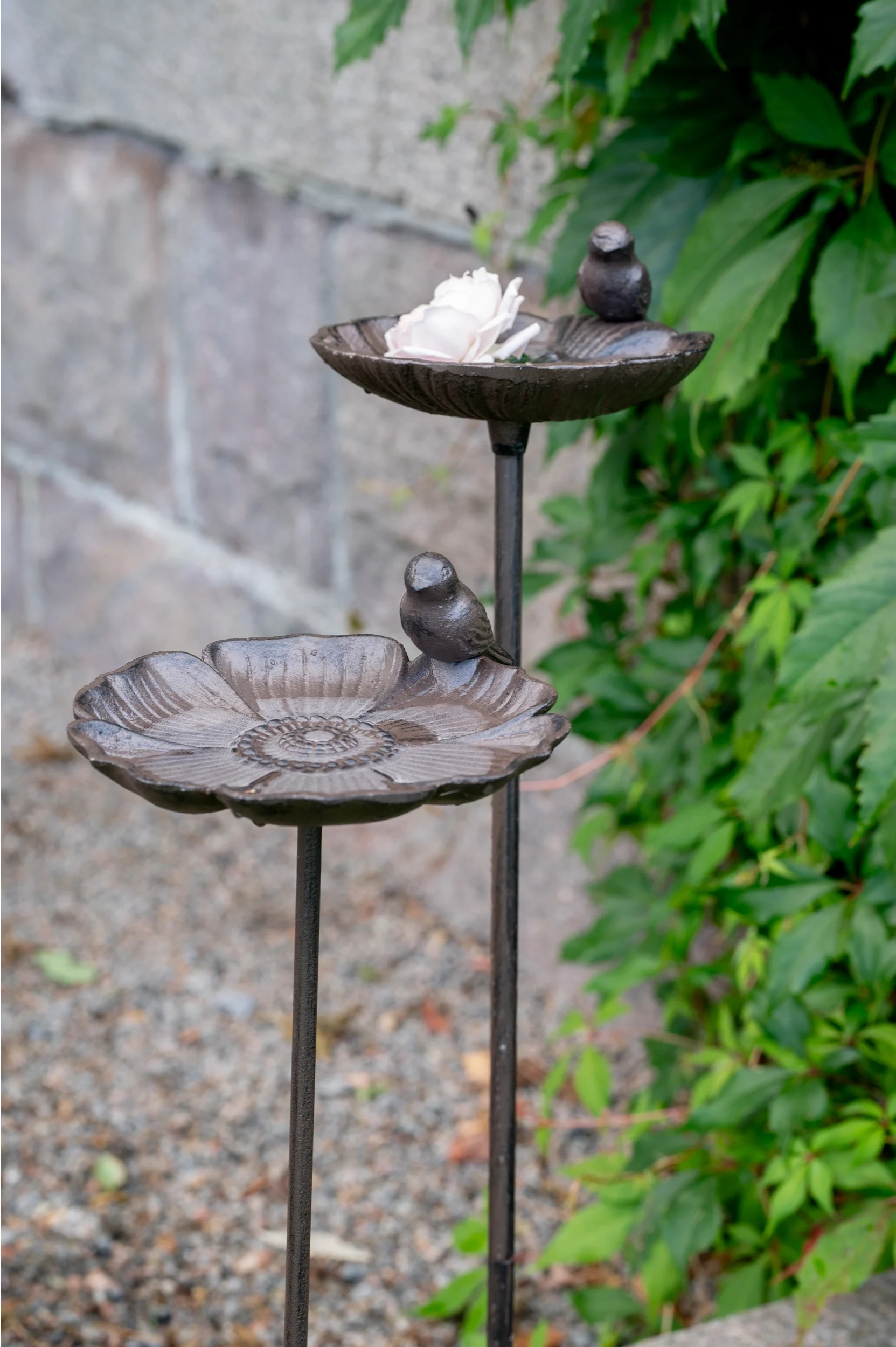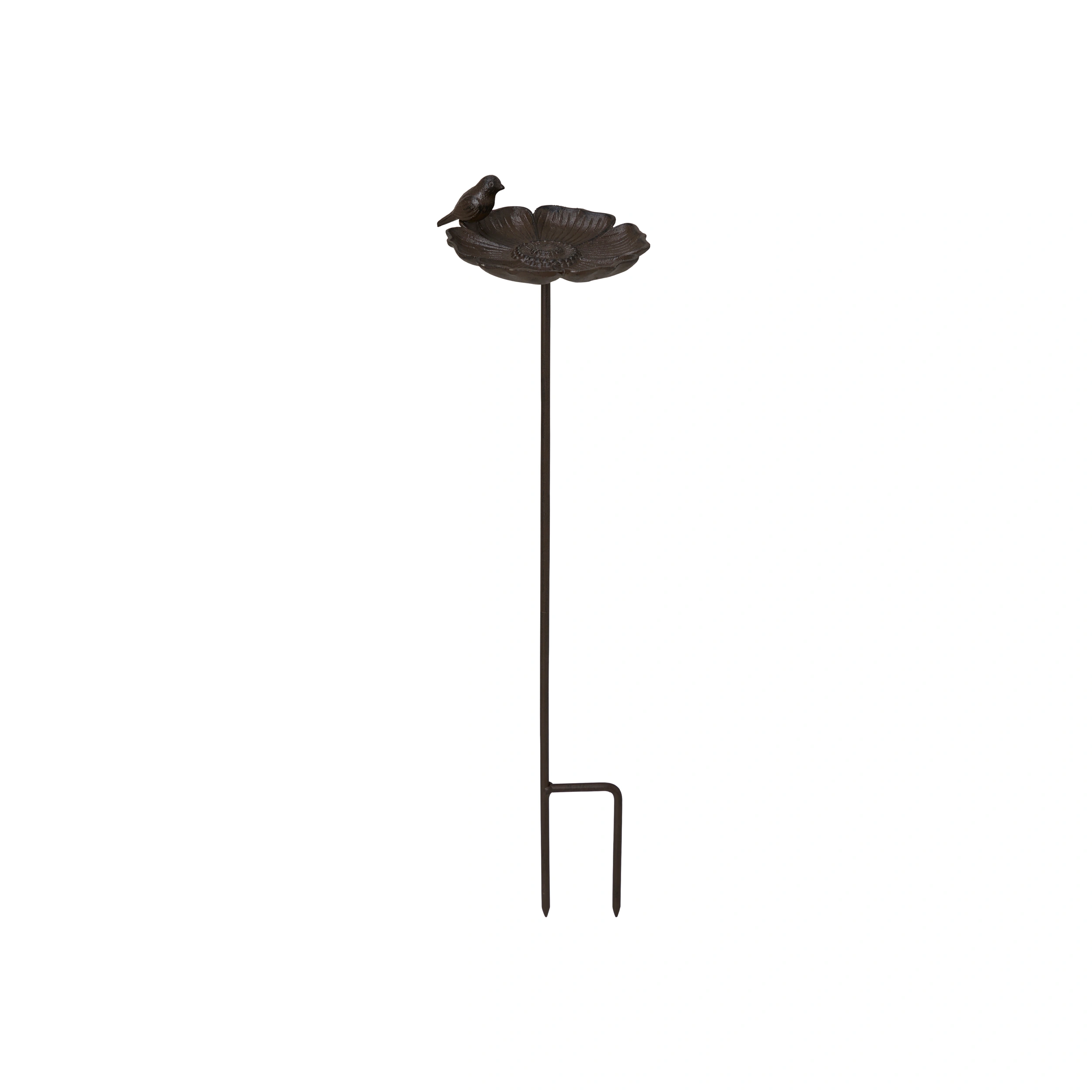 Dekorativt fågelbad på pinne att sticka ner i rabatten eller en större kruka. Söt fågel på kanten.
