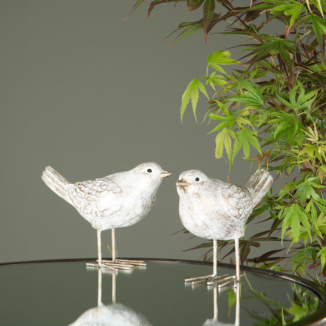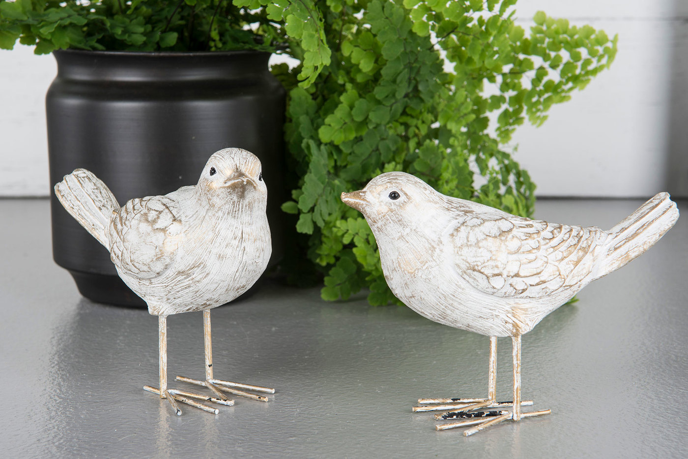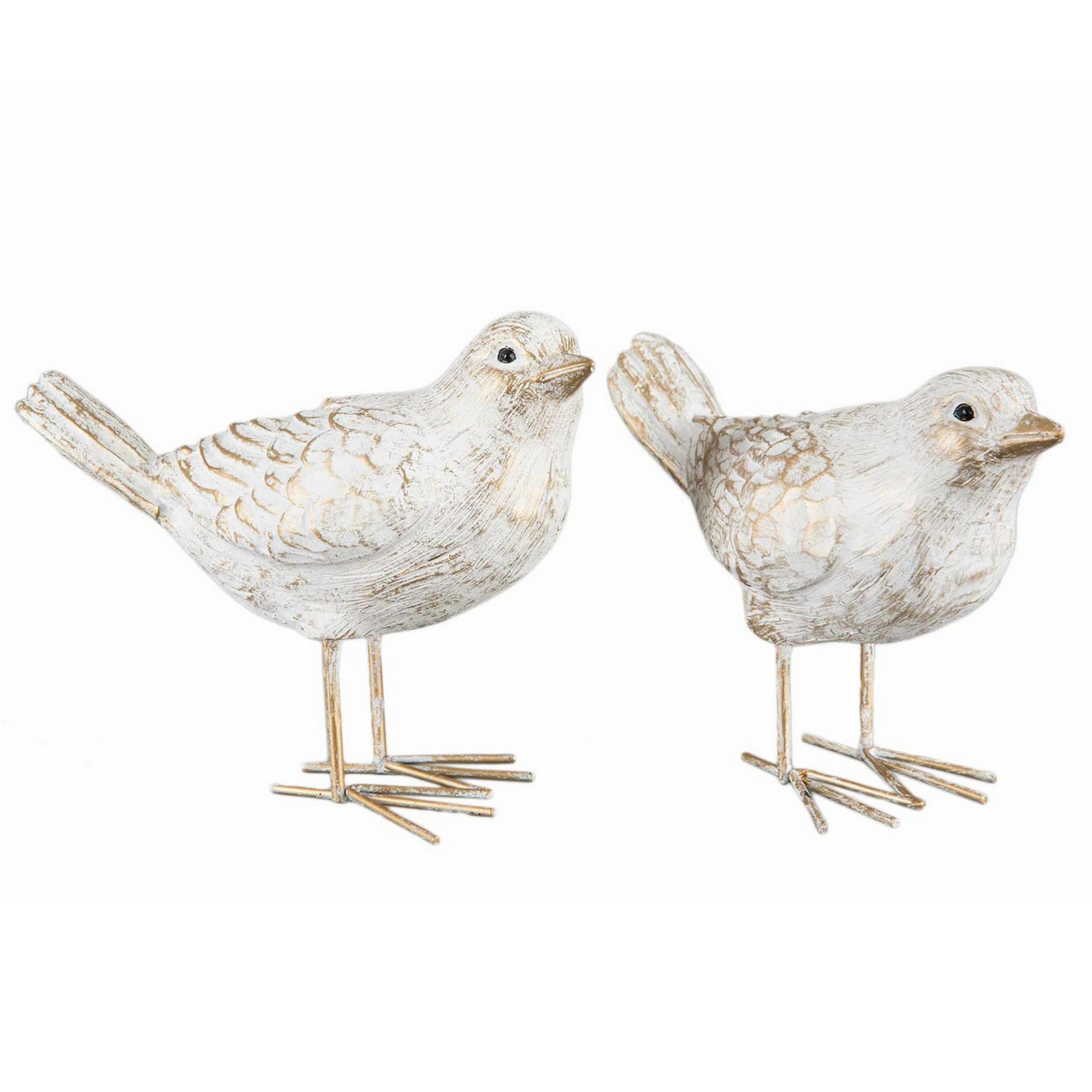 Söta dekorations fåglar i vit / guld färg. Lika fina i prydnadshyllan som i trädgården / i en plantering.