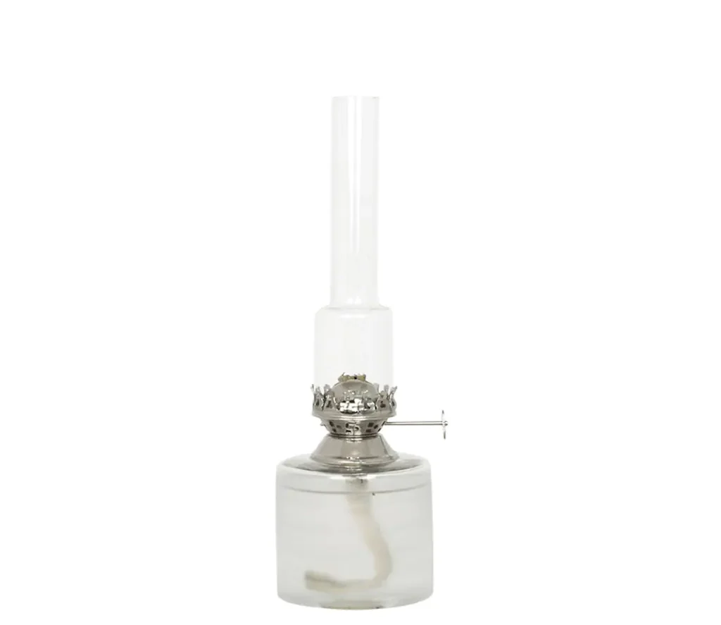 Traditionell fotogenlampa / oljelampa i frostat glas. Brännare i silver / nickel. Inklusive en veke.