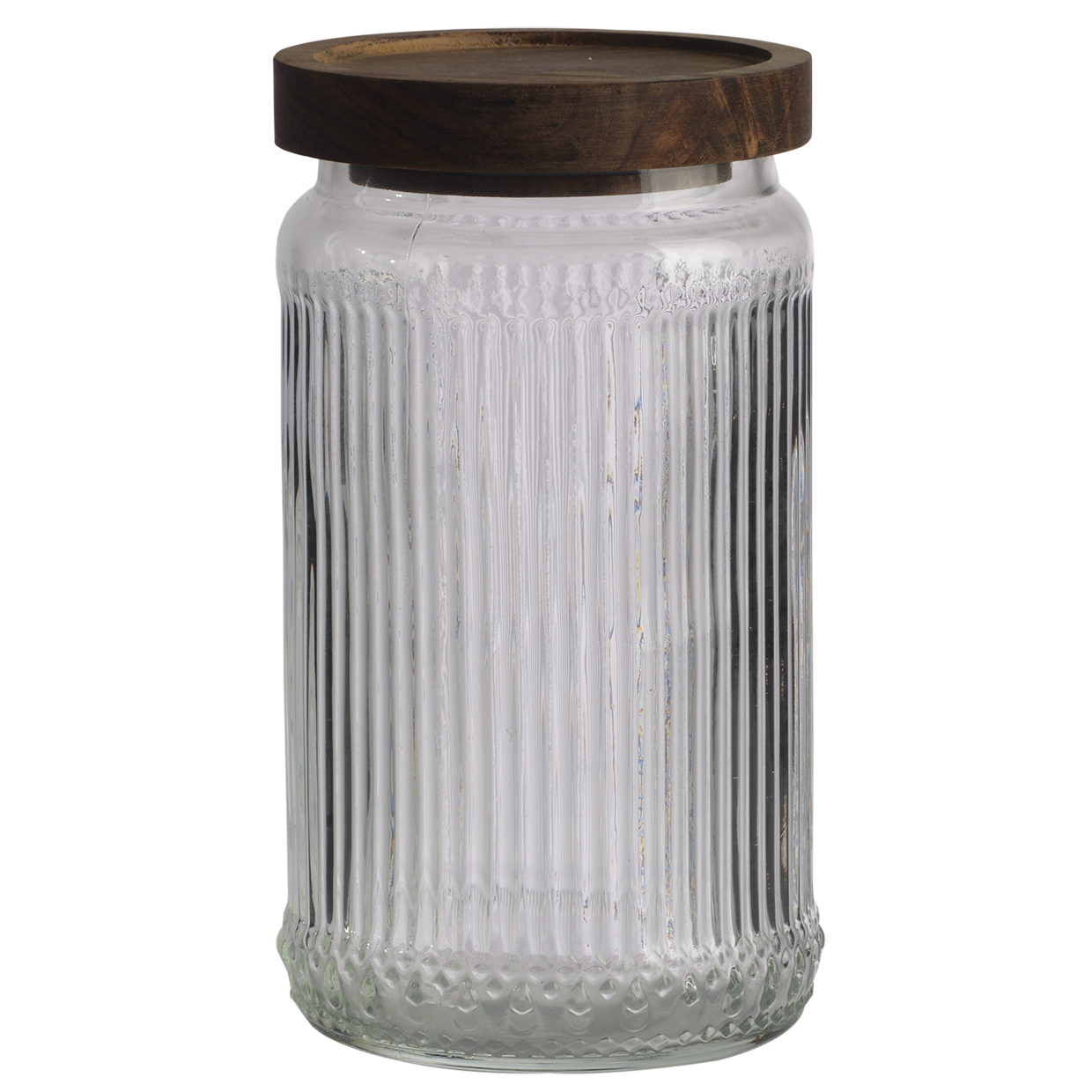Stilren glasburk med räfflat / randigt glas och trälock. Burken passar perfekt till kaffe, the, musli mm.