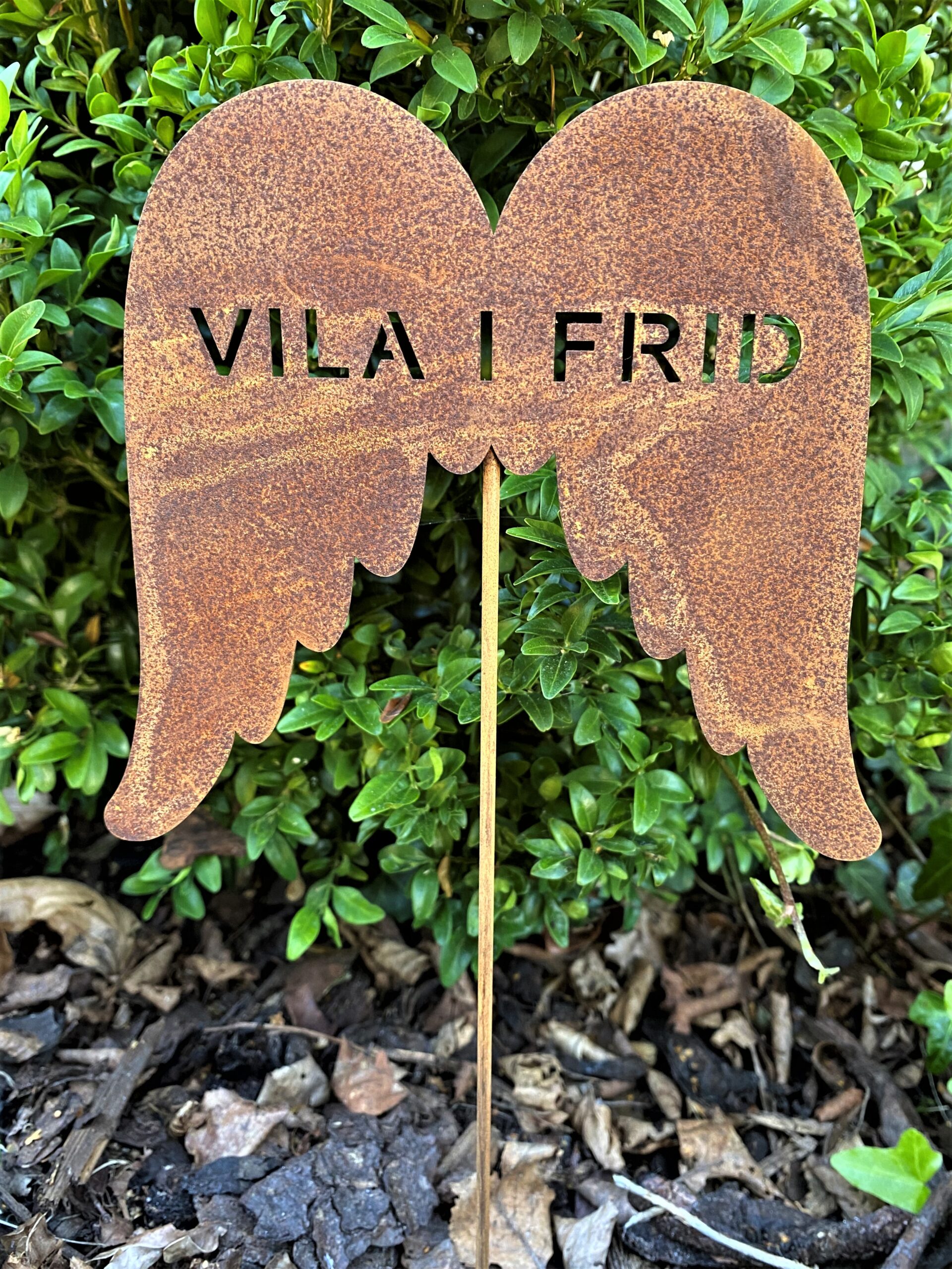 Vacker rostig gravdekoration med vingar och texten ”vild i frid”.