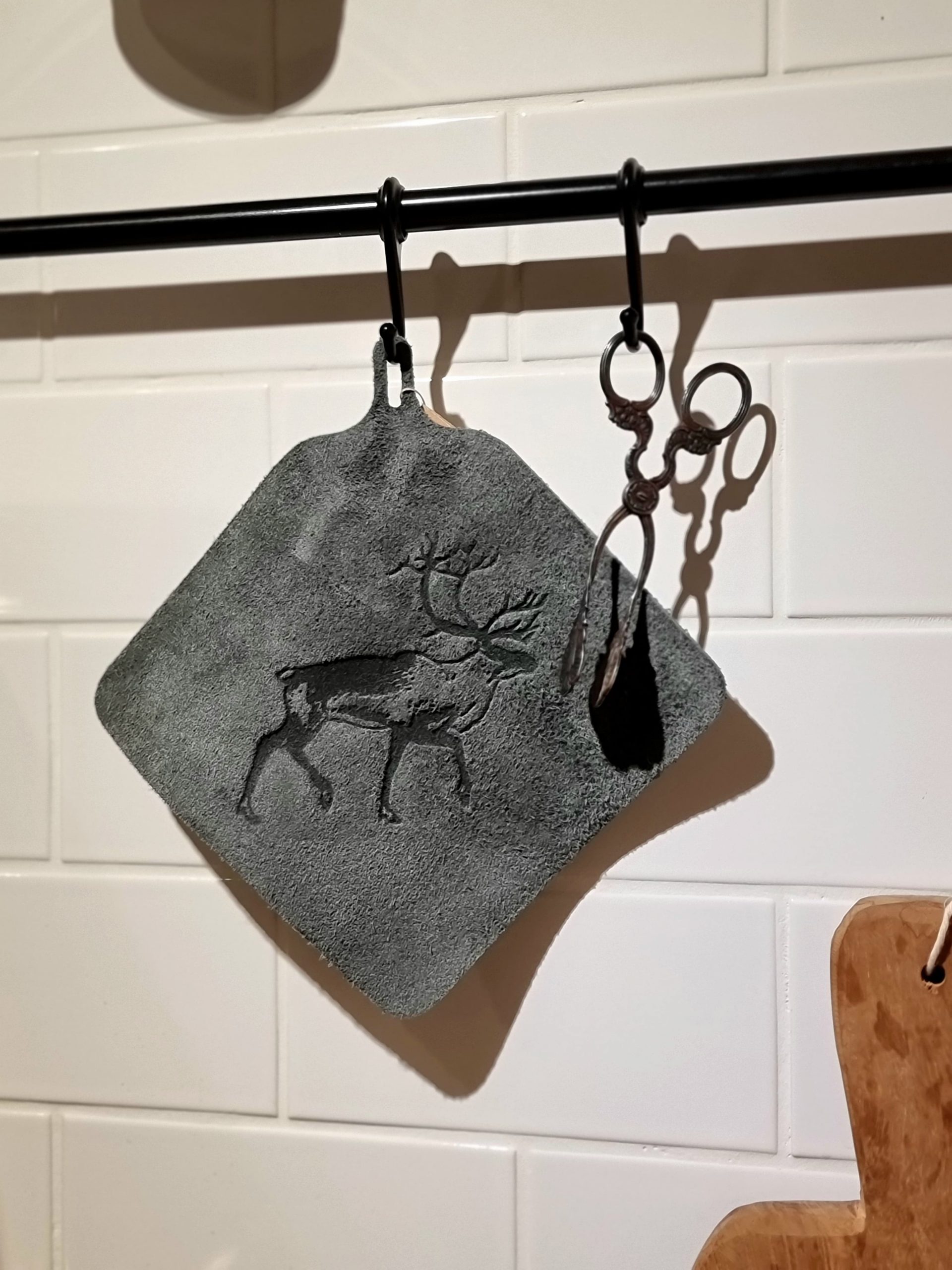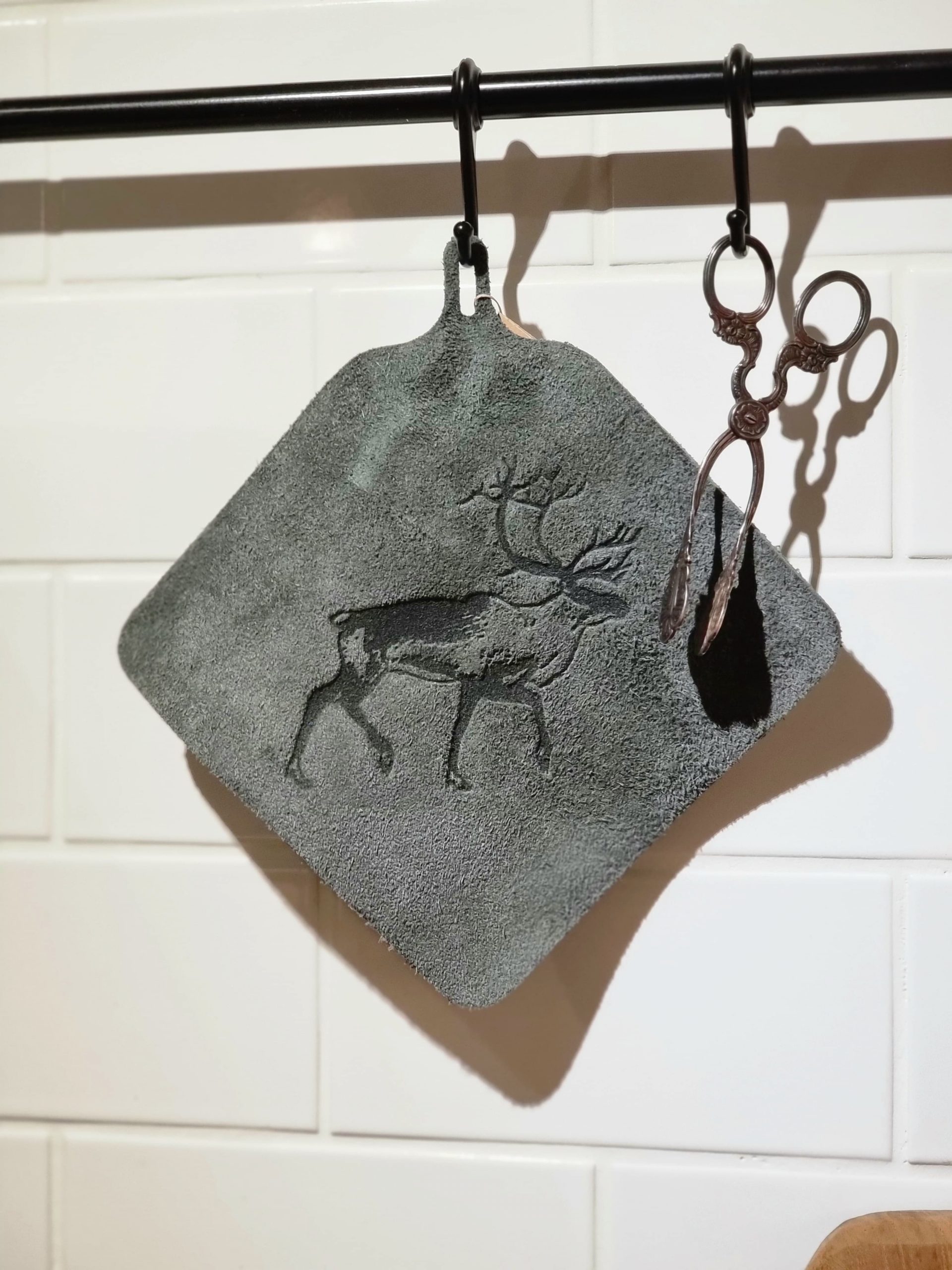 Handgjord grytlapp i grå spaltmocka, med motivet av en ren. Lokalproducerade i Sverige vid Tärnsjö garveri.