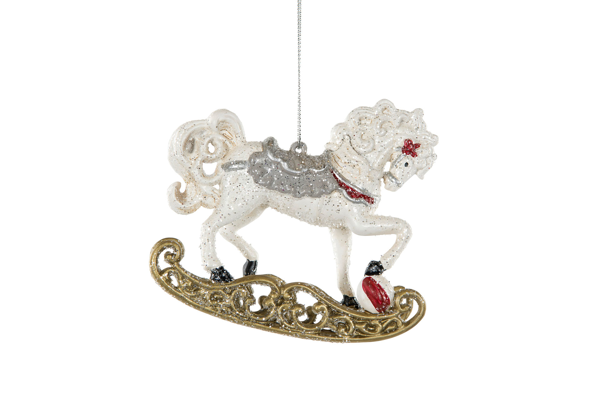 Två söta gunghästar i snöre att dekorera barnrummet eller julgranen med.