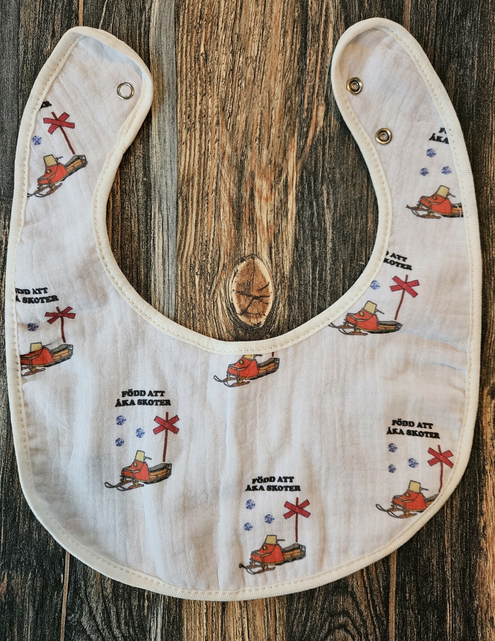 Absorberande haklapp eller dregglis med skotrar och texten ”Född att åka skoter”. Dubbelt tyg.
