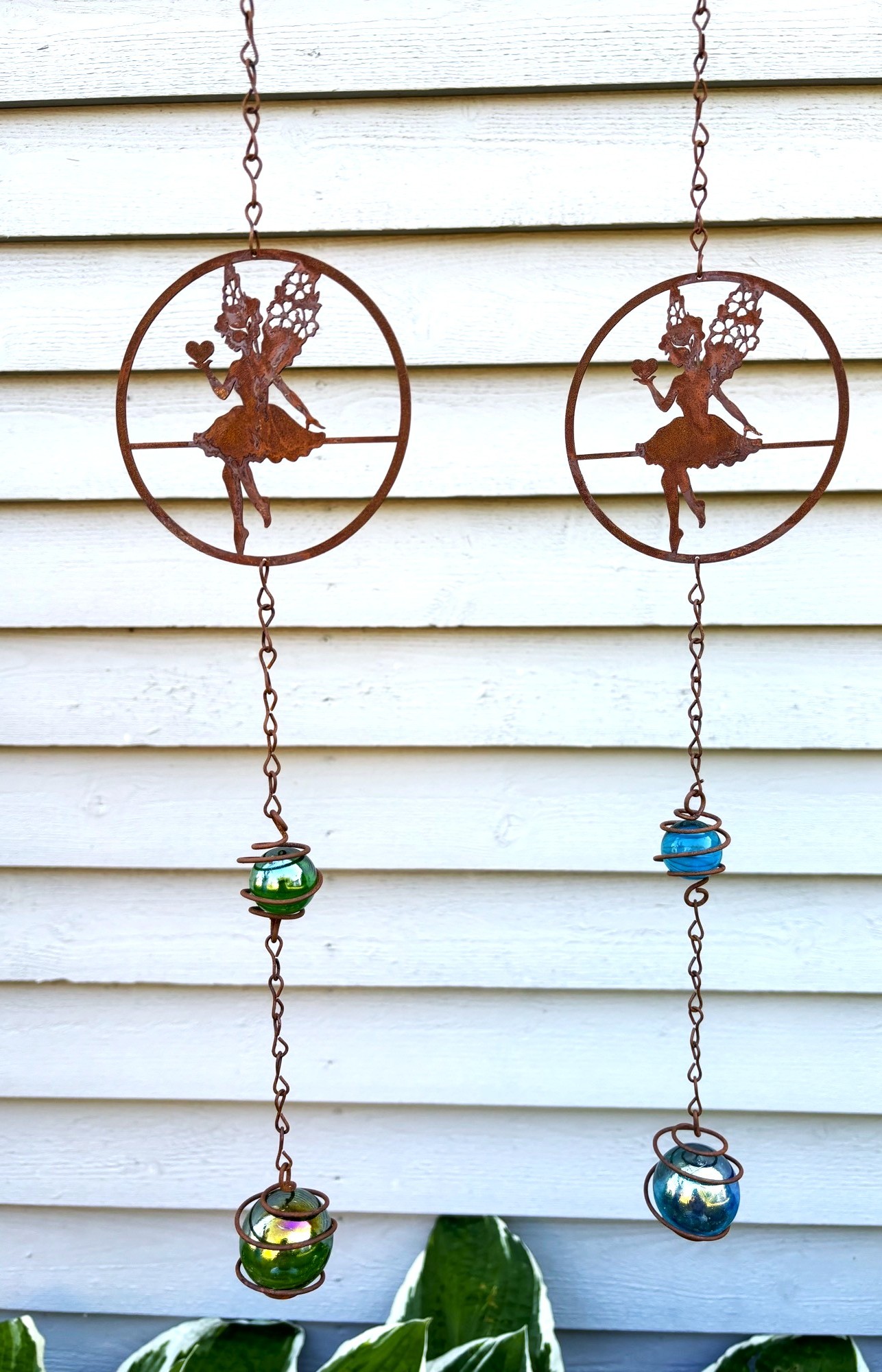 Vacker hängande trädgårdsdekoration med en sittande älva på tråd som bildar ett vackert blickfång i trädgården. Krok på toppen och 2 glaskulor nertill.