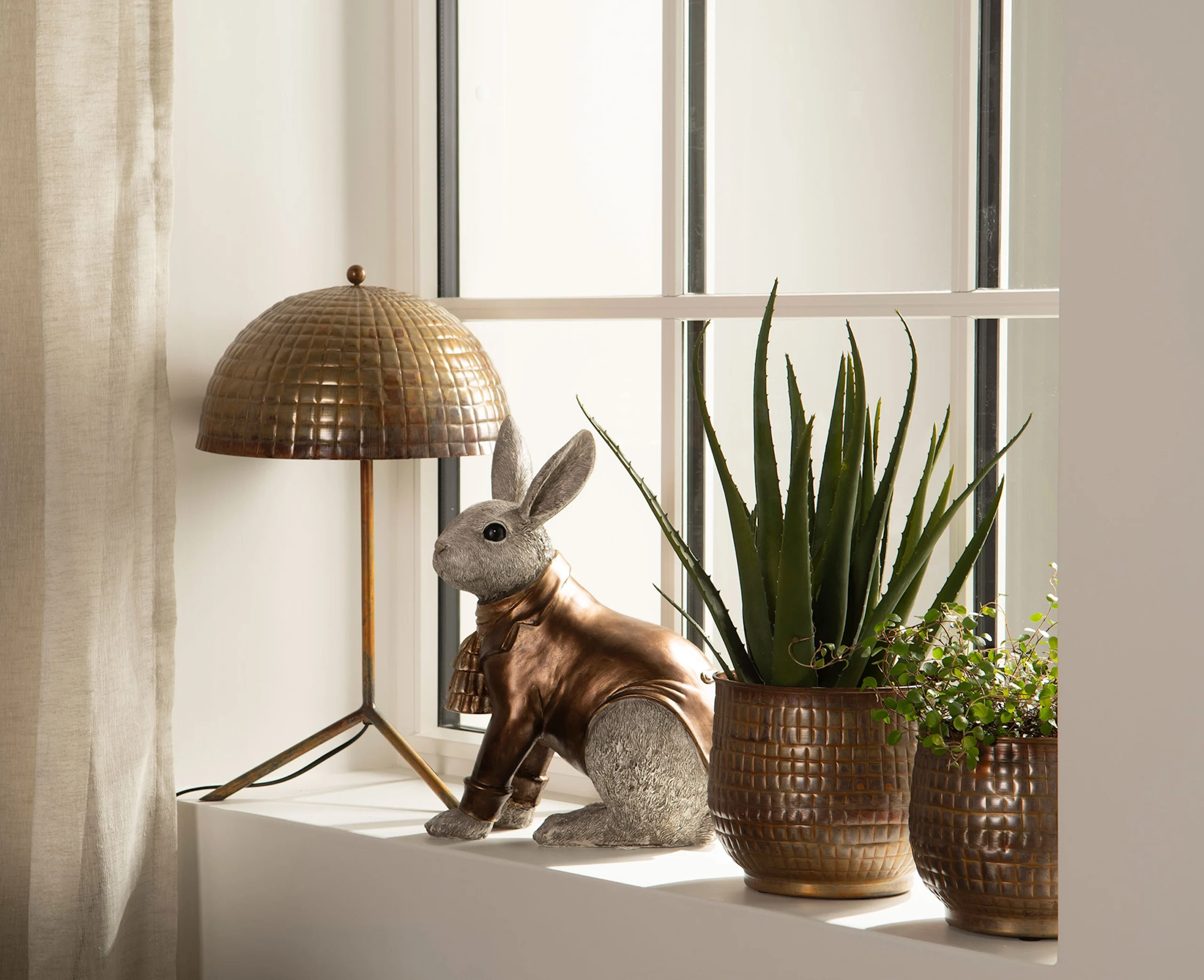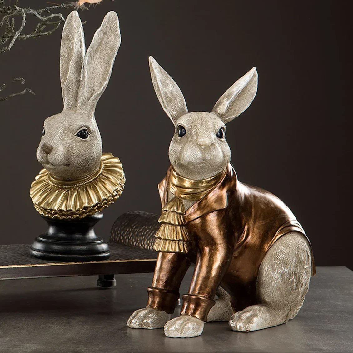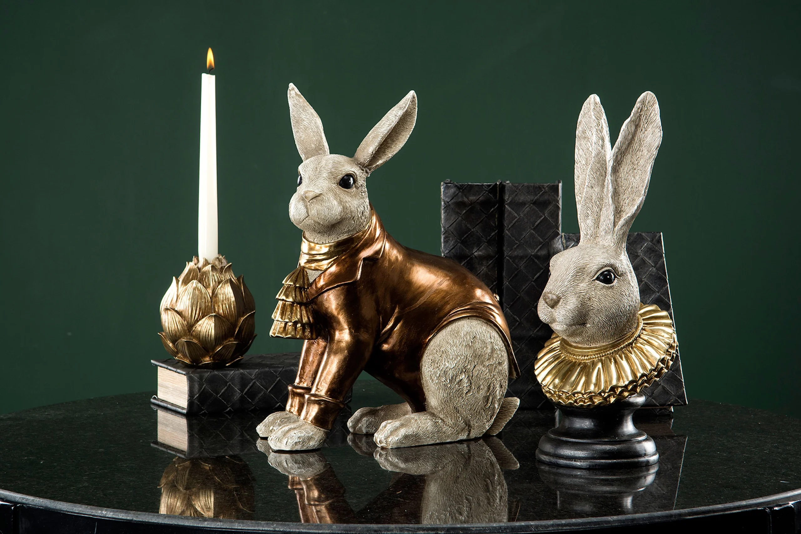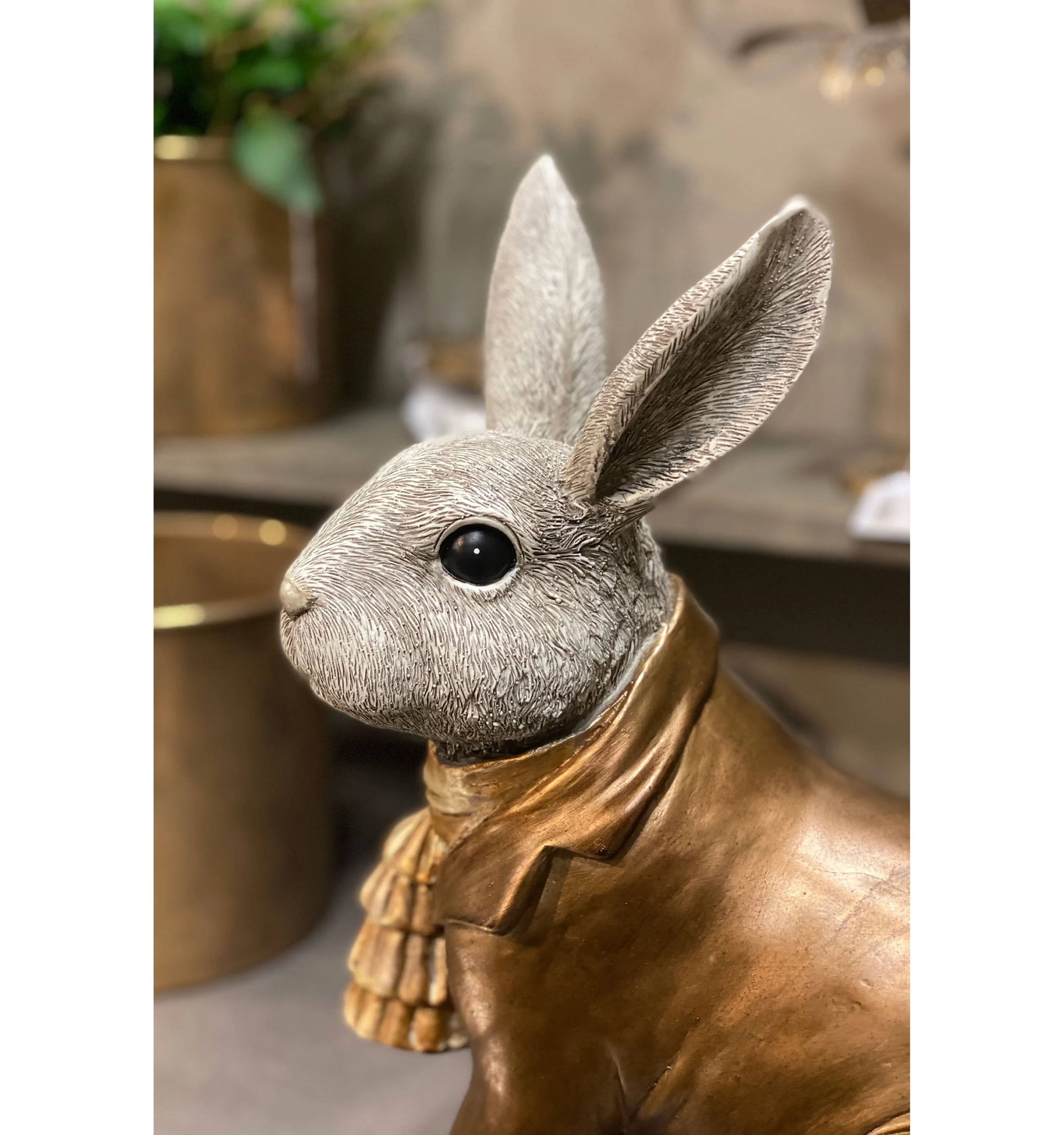 En maffig juldekoration i form av en stor sittande kanin med sina guldiga kläder. En juldekoration utöver det vanliga!