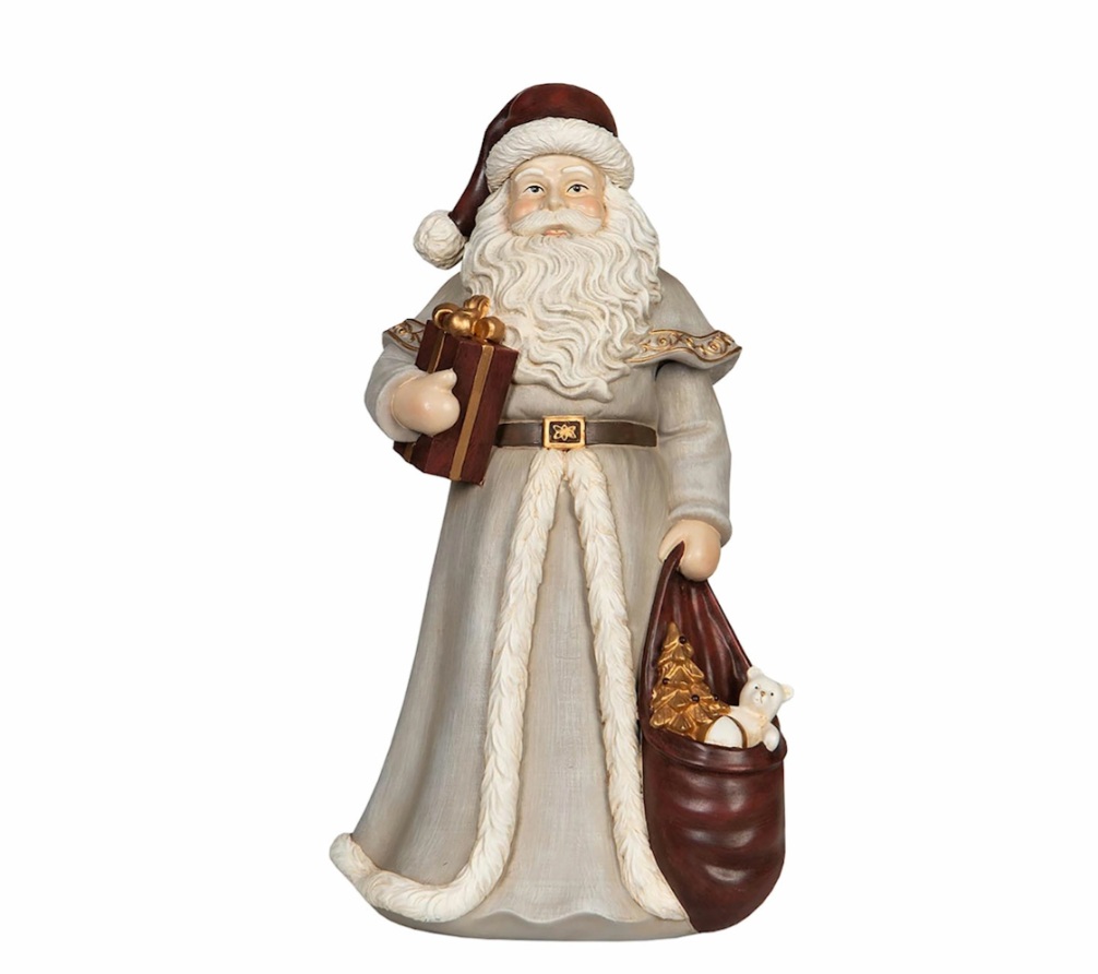 En maffig juldekoration i form av en grå tomte med sina röda julklappar och säck.