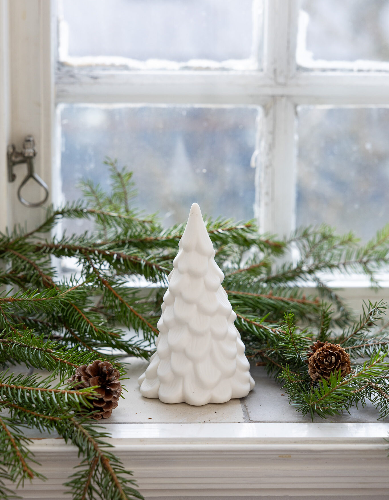 Dekorativ julgran i vit matt keramik. Julgranen Norrskog finns i flera storlekar och passar tex perfekt att pynta med till våra ljushus byn.
