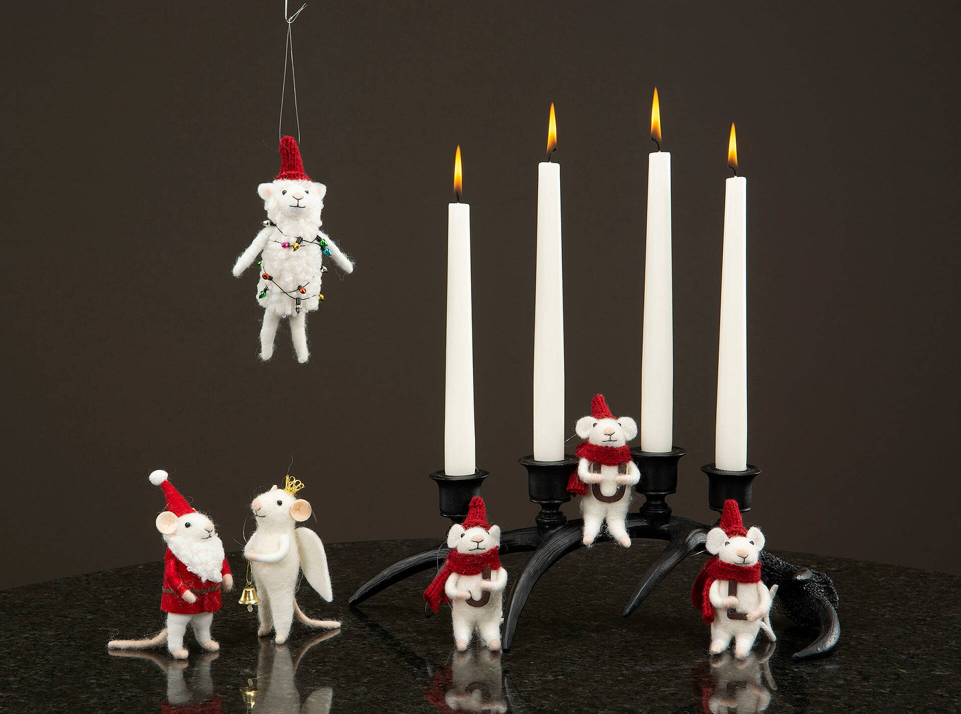 Söta julmöss med tyngd i baken så dem kan sitta stadigt. Säljs i 2-pack.