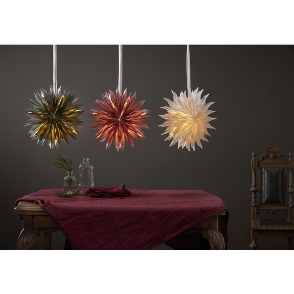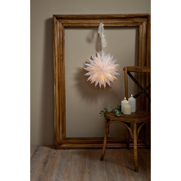 Fantastisk vacker julstjärna / adventsstjärna i semi transparent vitt papper. Ett dekorativt band ingår för att med enkelhet kunna hänga upp stjärnan. Kan hängas i både fönster och på väggen. För inomhusbruk.