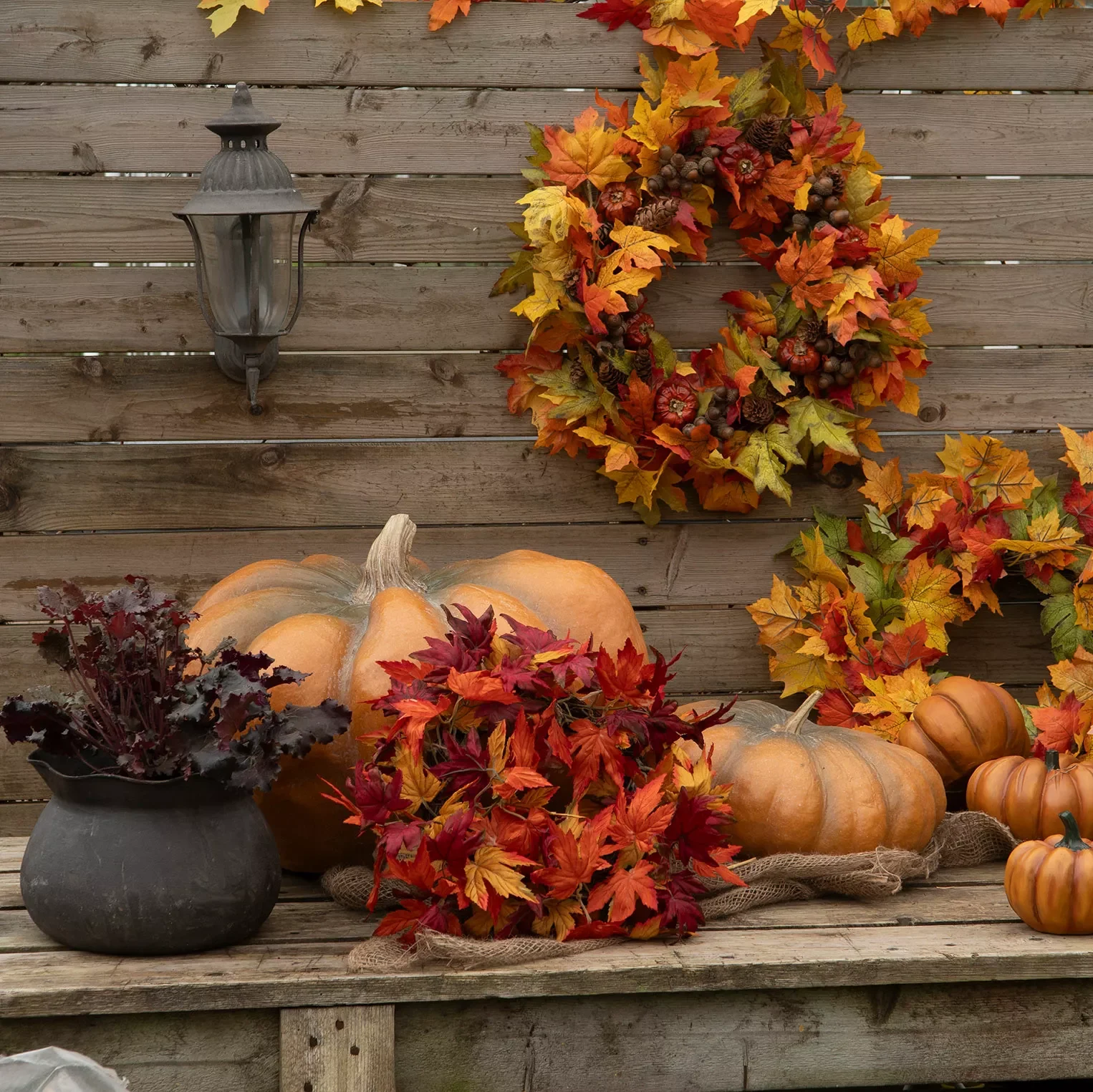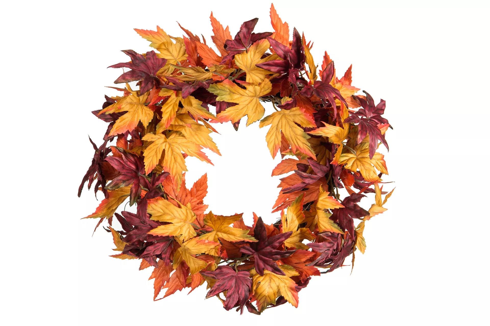 Mysig krans av lönnlöv i höstens härliga färger. Vattentålig. Fin att dekorera med på dörren.
