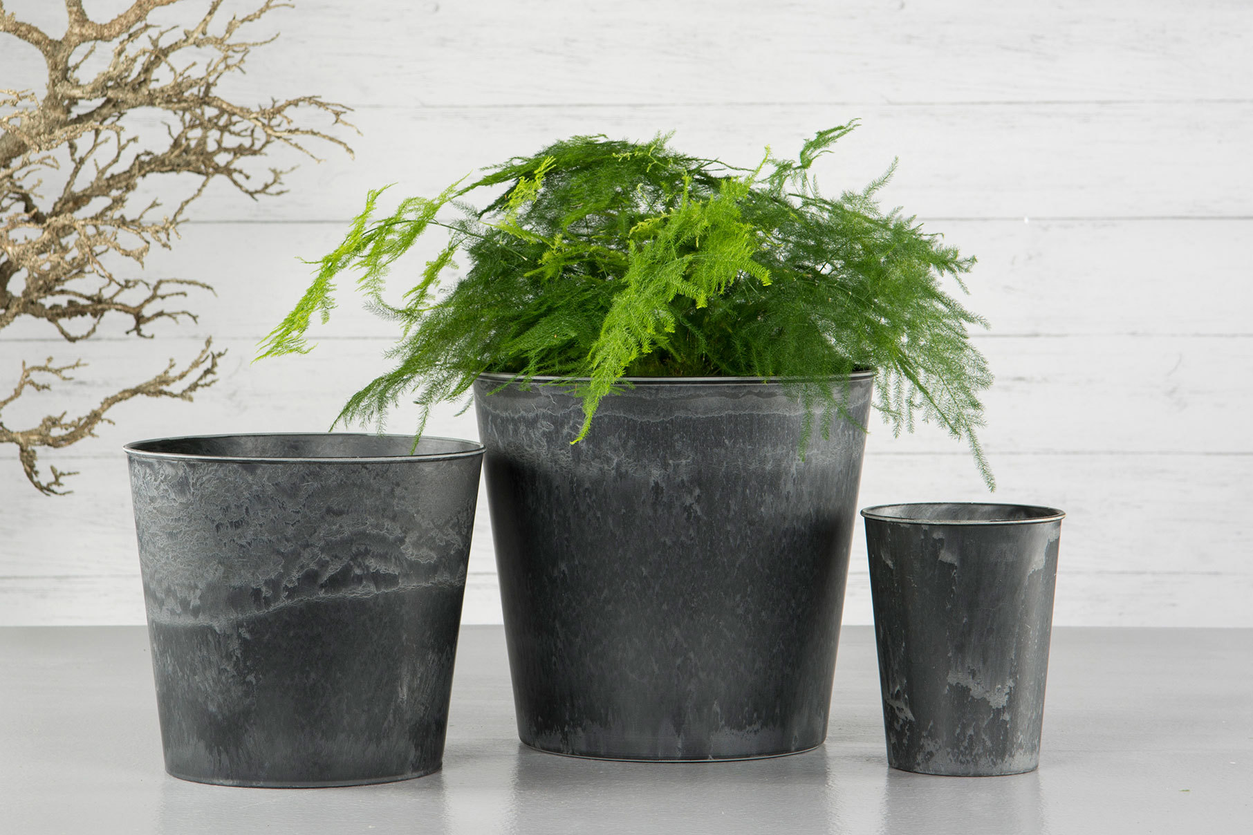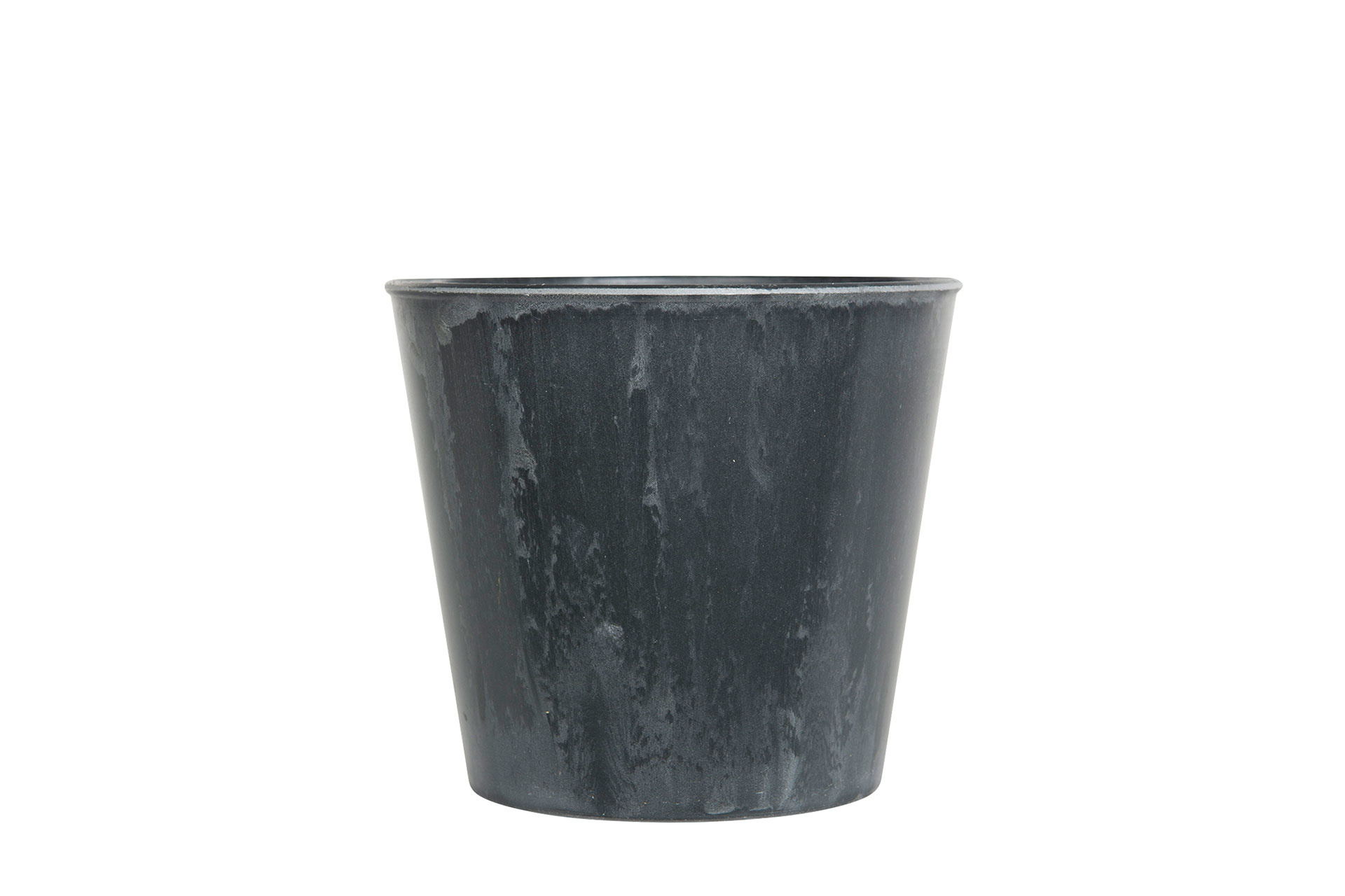 Stilren kruka i gråmelerad plast. Ser ut som metall. Passar lika bra inne som ute.