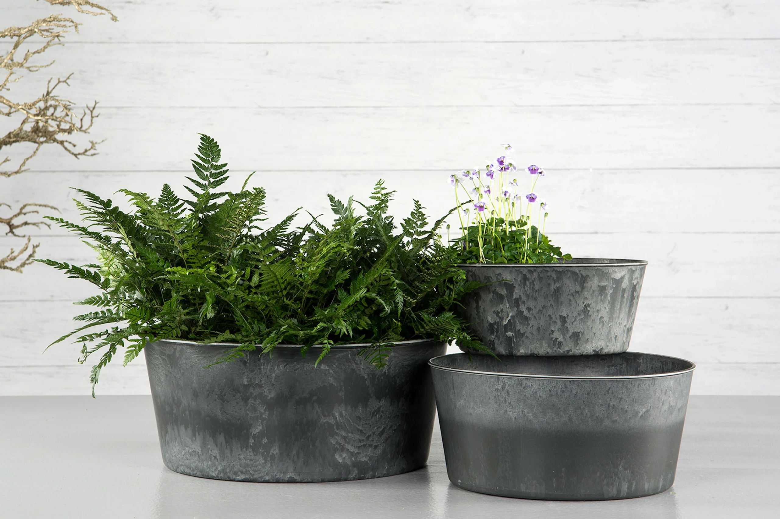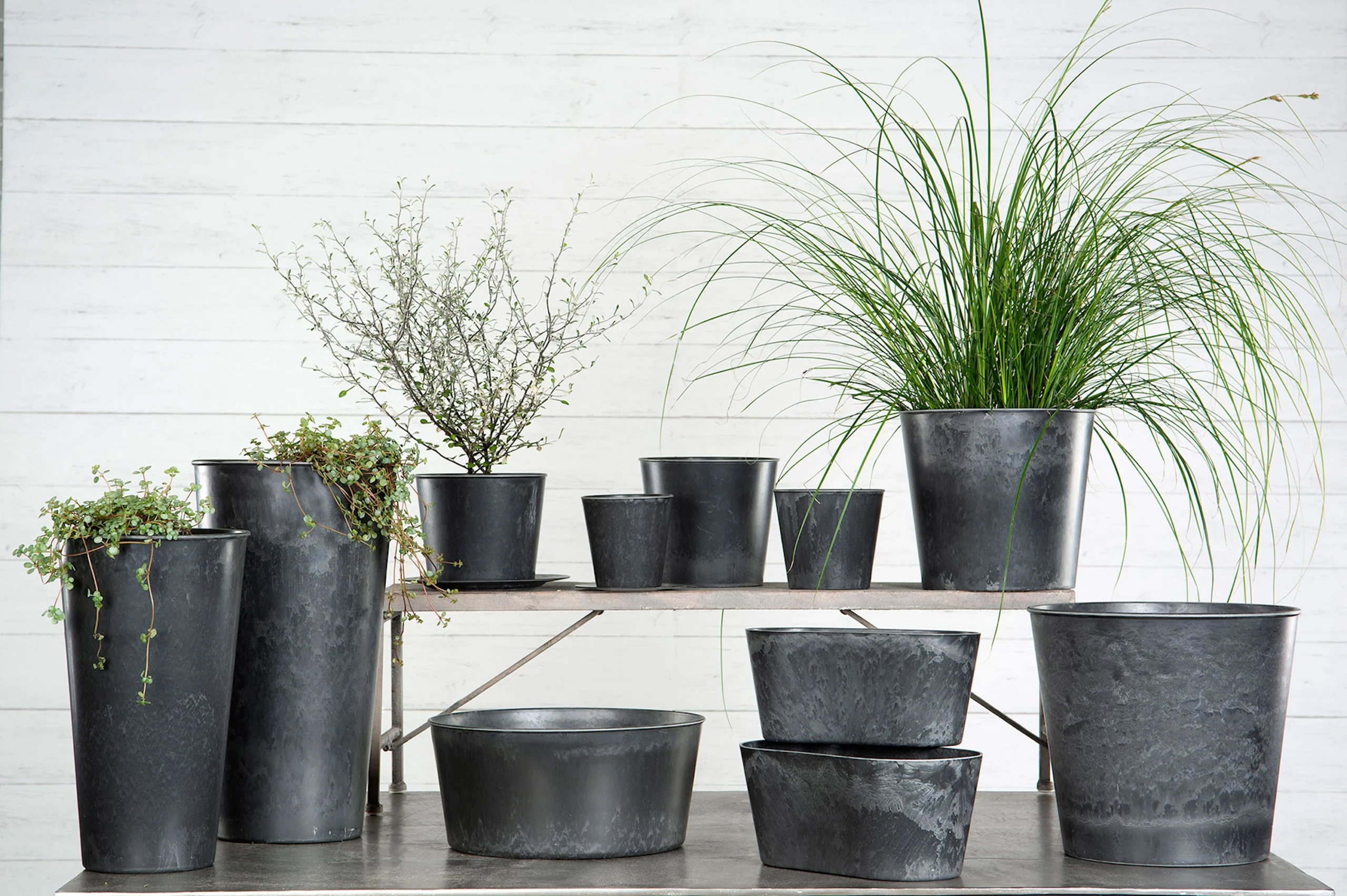 Stilren kruka i gråmelerad plast. Ser ut som metall. Passar lika bra inne som ute.