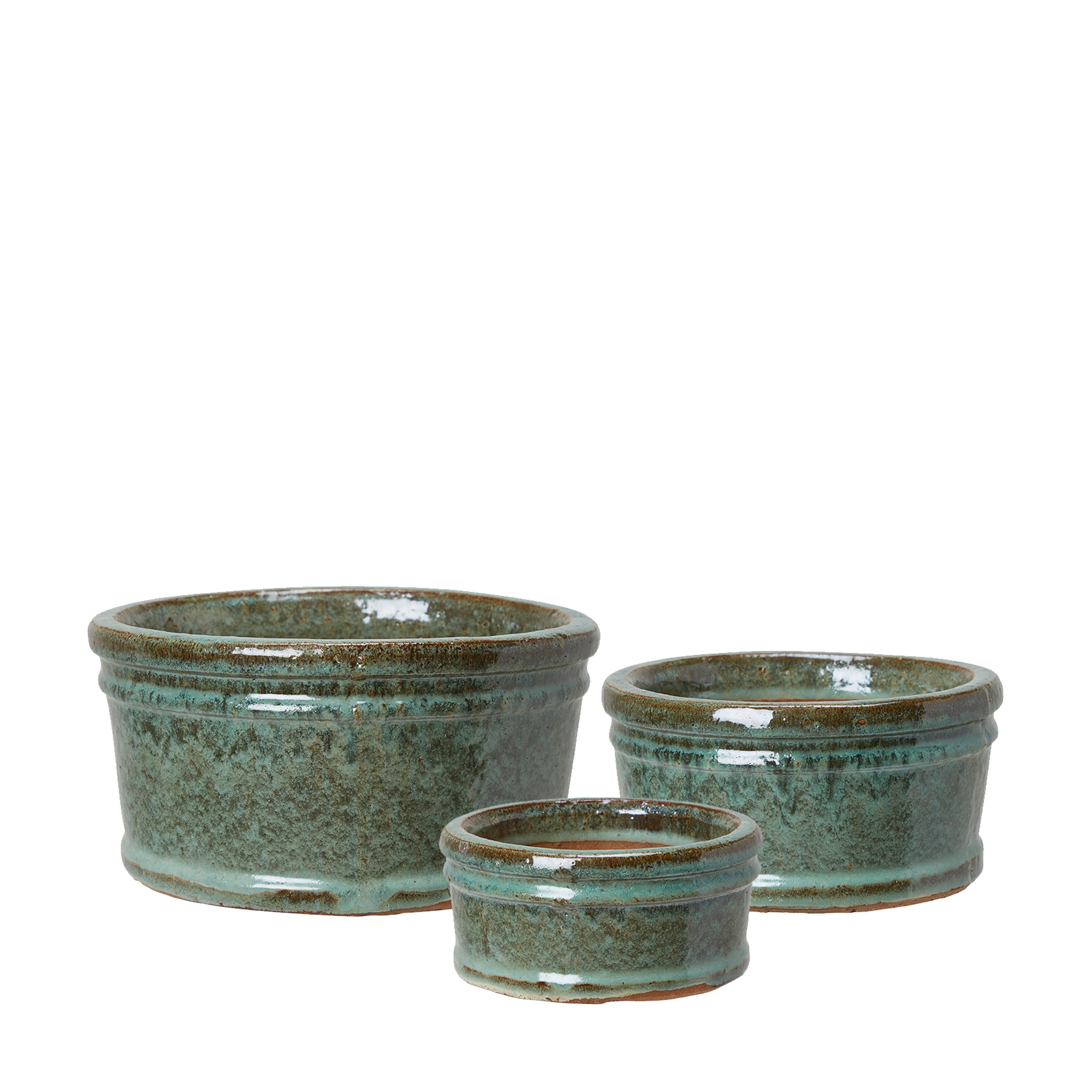 Rund kruka i terrakotta med en underbar grön glasering för utomhusbruk. Dräneringshål i botten. Säljs i 3-pack.