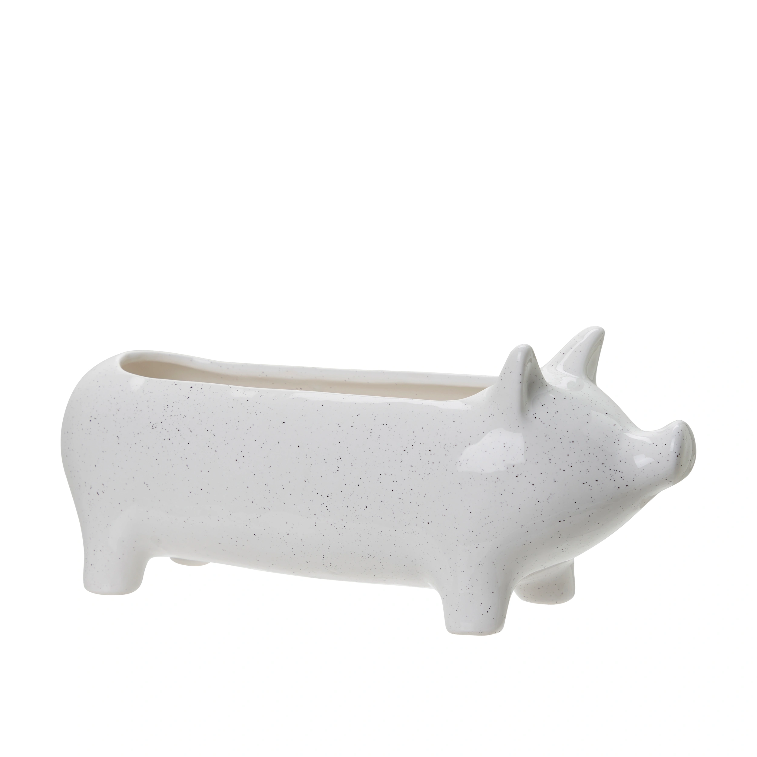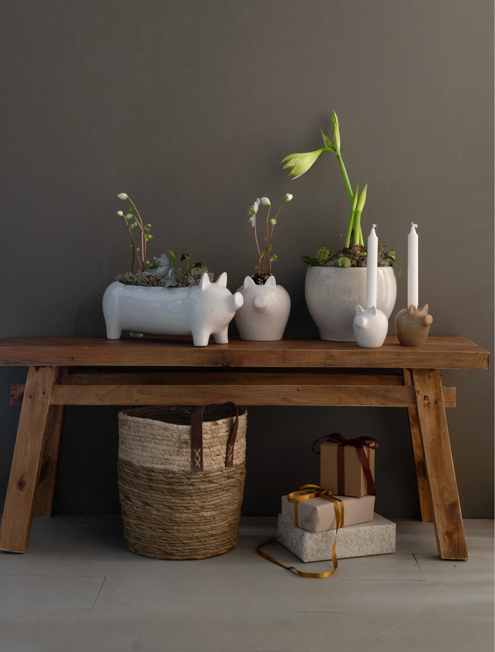 En klassisk juldekoration i form av en avlång julgris kruka i vitt stengods.