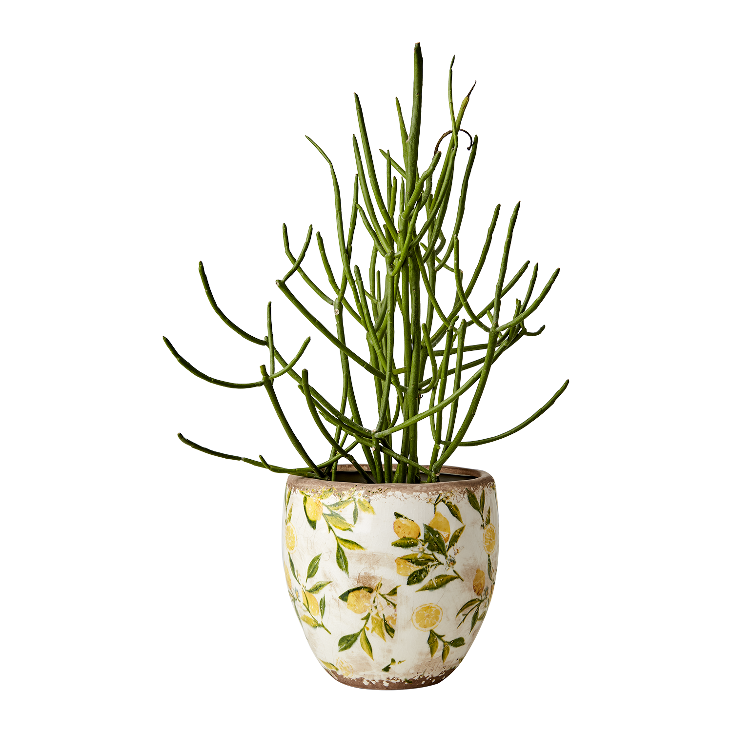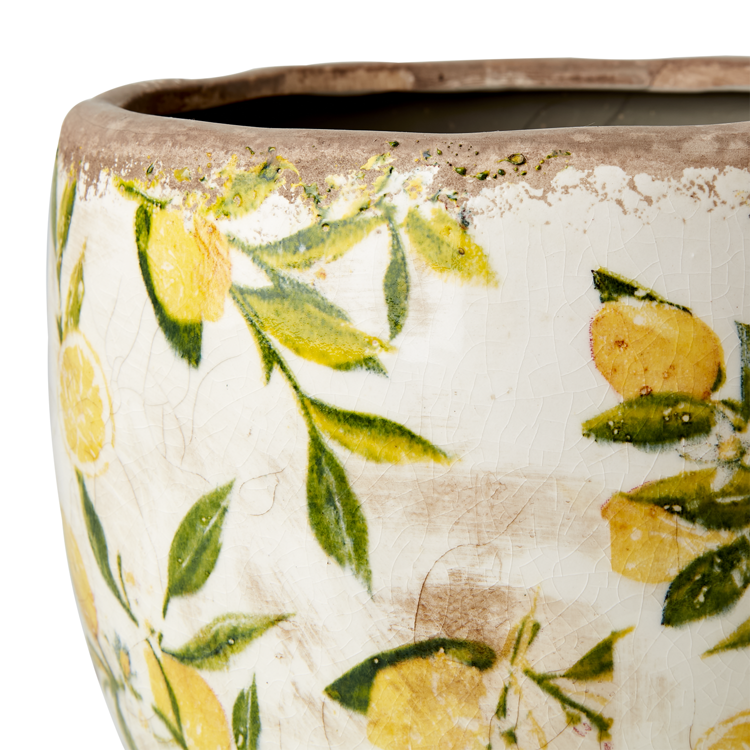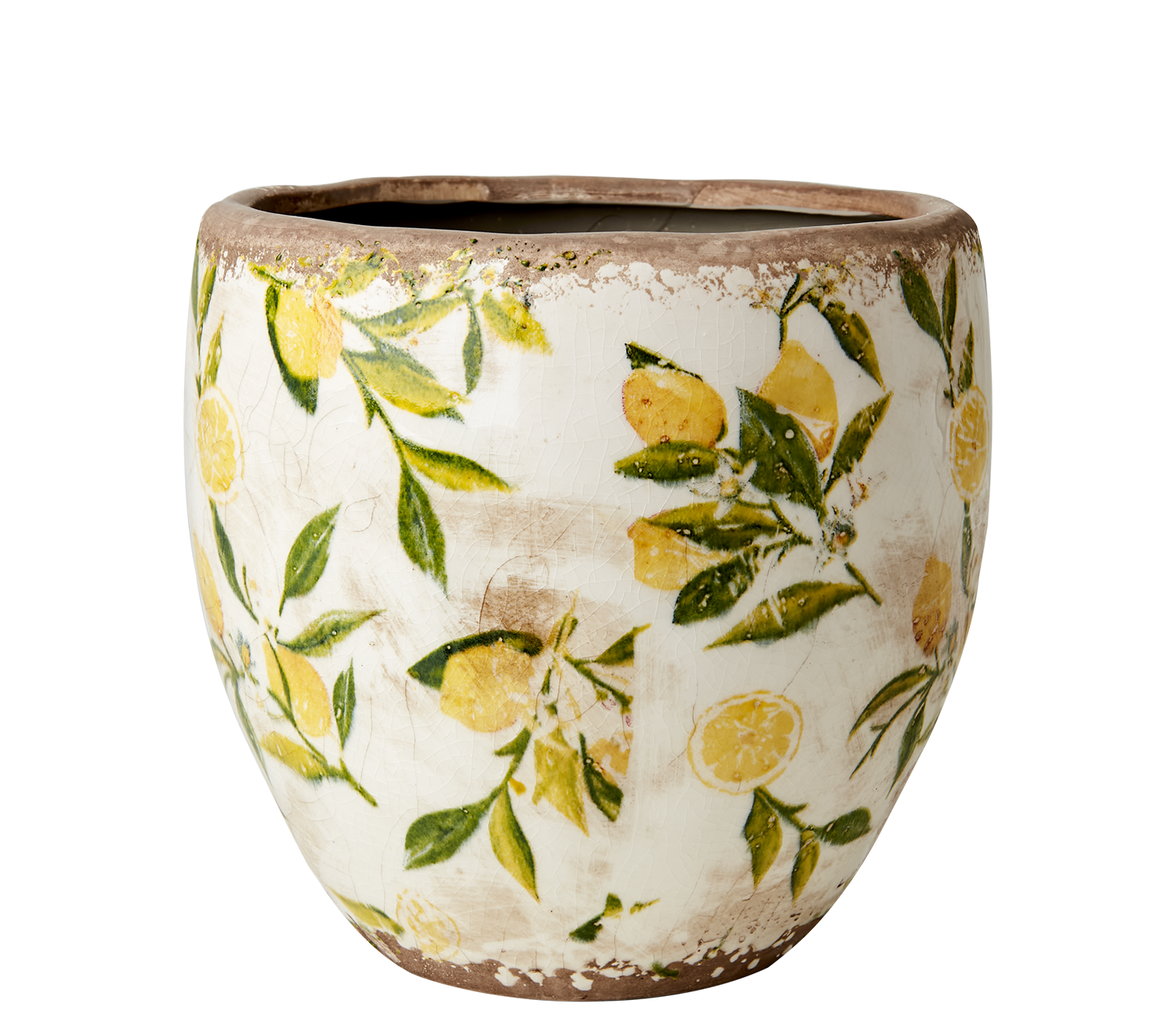Dekorativ glaserad kruka lemon i stengods med en patina som ger en gammaldags stil med mönster av citronkvistar i gult och grönt. Poröst material, använd därför vattentätt fat eller plastpåse på insidan.