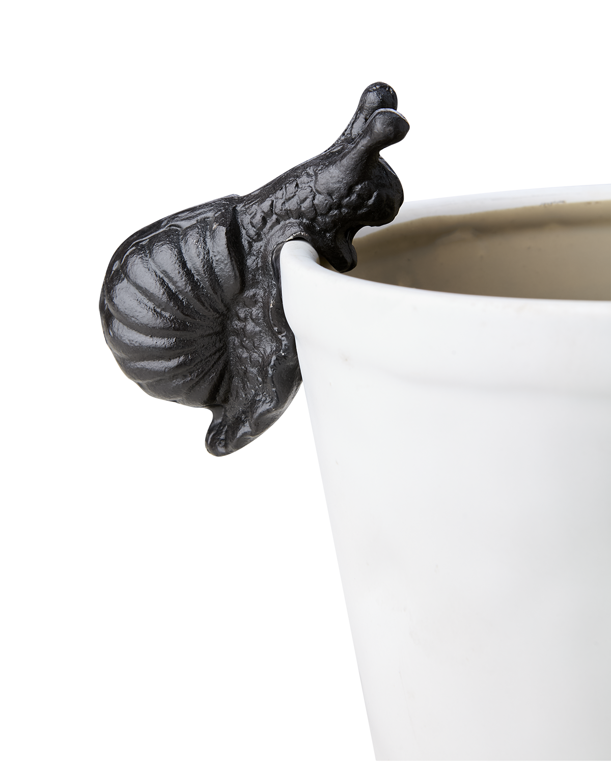 Söt krukdekoration i form av en snigel i svart gjutjärn att hänga på valfri kruka.