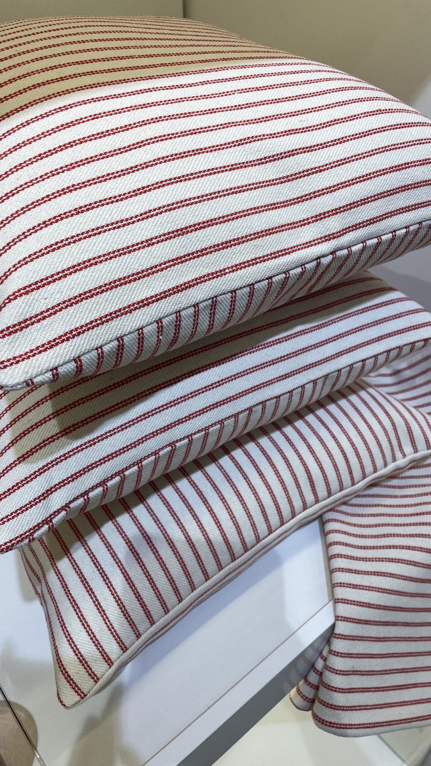 Mysigt kuddfodral i vitt med röda ränder. Dragkedja i underkant. Kudden har ett grövre tyg som ger en robust känsla. Komplettera med vår fluffiga innerkudde i dun för extra myskänsla.
