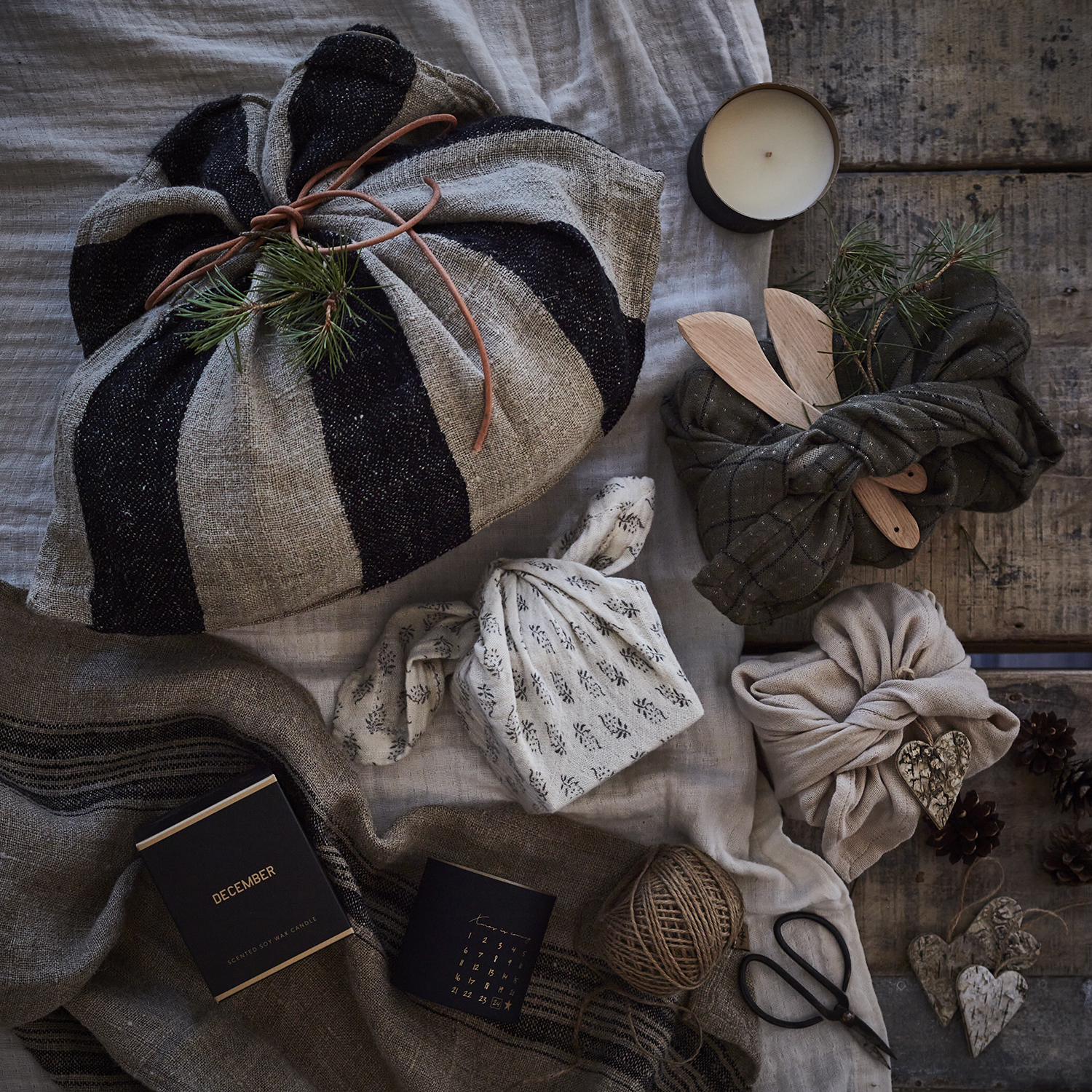 Underbar bordsduk i naturfärgat linne med svarta ränder i en tvättad rustik finish.