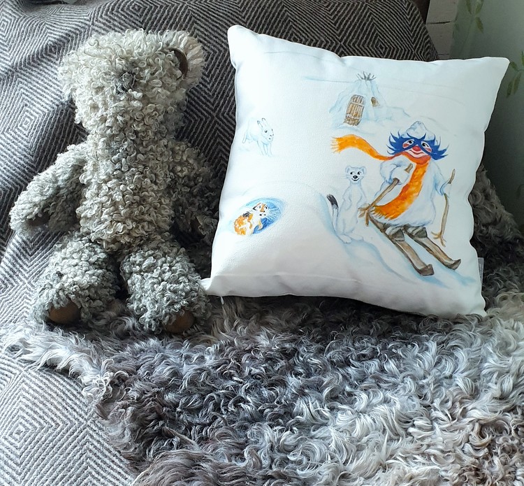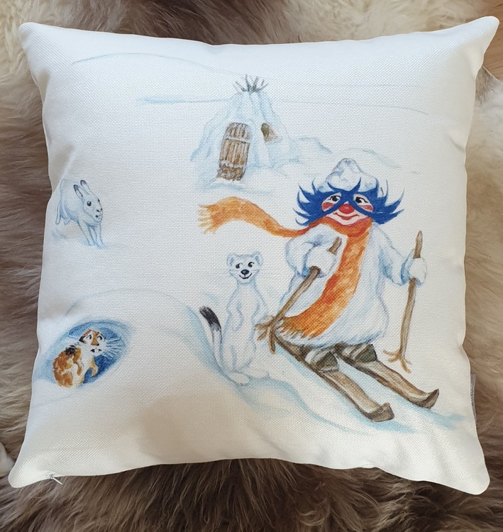 Superfin kudde med Plupp som åker skidor. Passar lika bra i barnrummet som i fjällstugan.