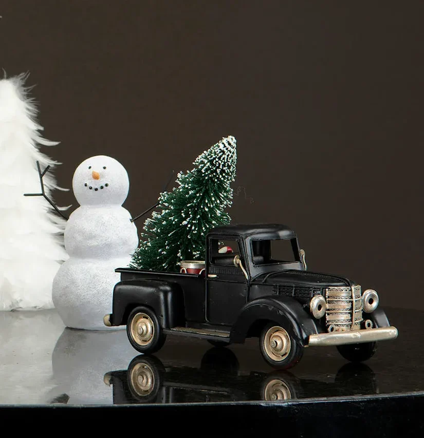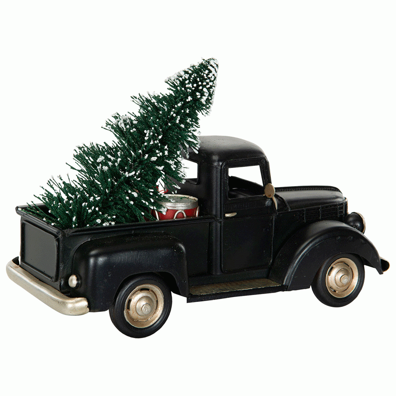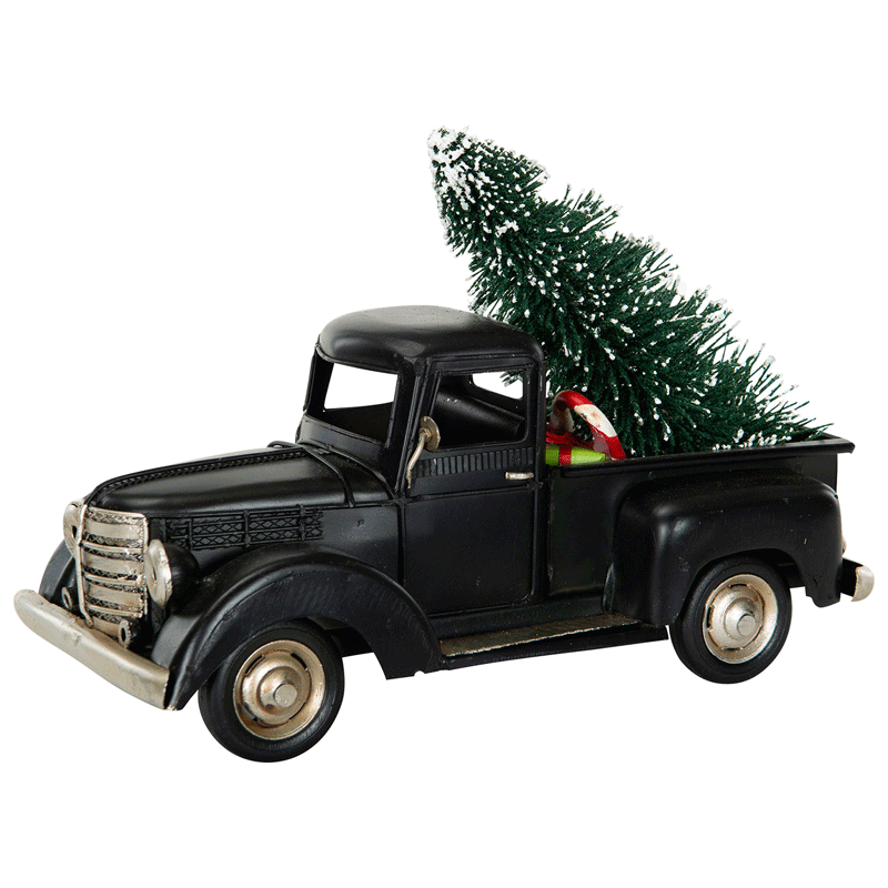 Charmig handgjord lastbil i svart metall lastad med en julgran på flaket. En annorlunda present / samlarobjekt eller en fin detalj i barnrummet.