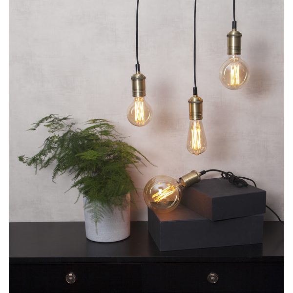 LED-lampa i amberglas. Spiralfilamentet skapar ett varmt och mjukt sken. Färgtemperaturen är 2100K, den är dimmerkompatibel och med E 27-sockel.
