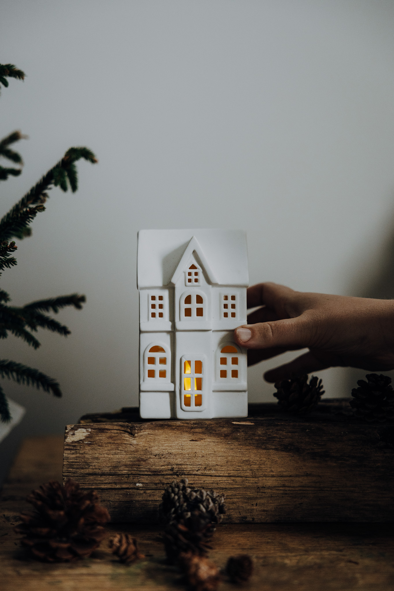 Mysigt ljushus / huslykta i vit matt keramik. Du kan välja att placera huslyktorna tillsammans på sidobordet och skapa en by med upplysta hus genom att placera en ljusslinga inuti dem. Husens olikheter i form och storlek