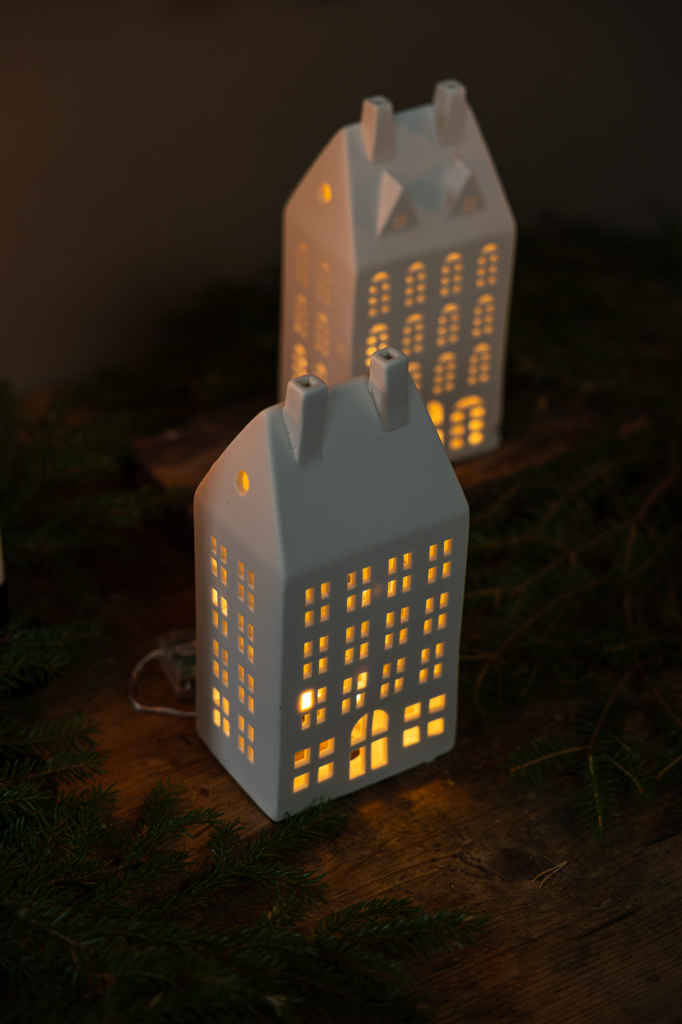OBS! Placera EJ värmeljus inuti husen, endast för batteriljus / ljusslingor.