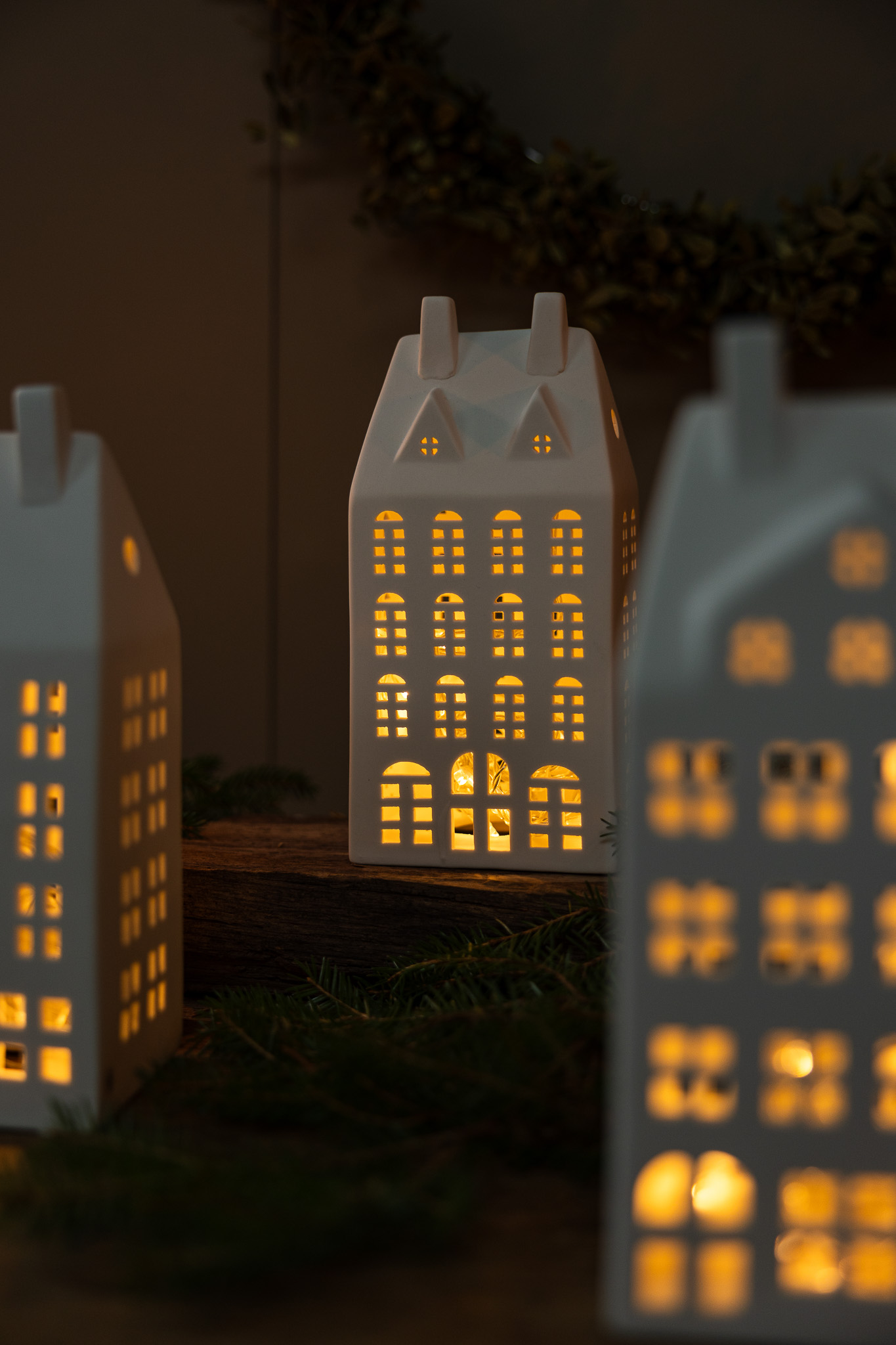Mysigt ljushus / huslykta storstaden nr 3 i vit matt keramik. Du kan välja att placera huslyktorna tillsammans på sidobordet och skapa en by med upplysta hus genom att placera en ljusslinga inuti dem. Husens olikheter i form och storlek gör det tacksamt att skapa en dynamik oavsett om du väljer att kombinera tre hus eller nio. Placera byn där det finns gott om utrymme så blir dem garanterat ett centralt blickfång i rummet.