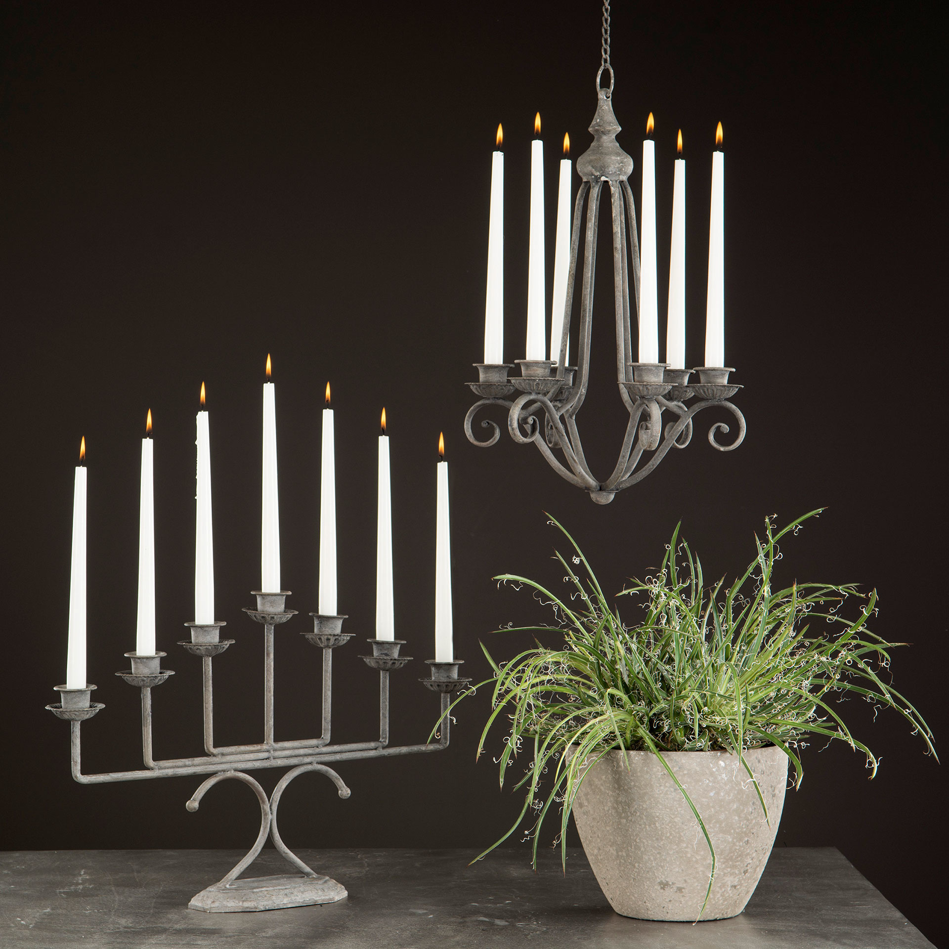 Maffig ljusstake i rustik stil med plats för sju kronljus i grå antikbehandlad metall.