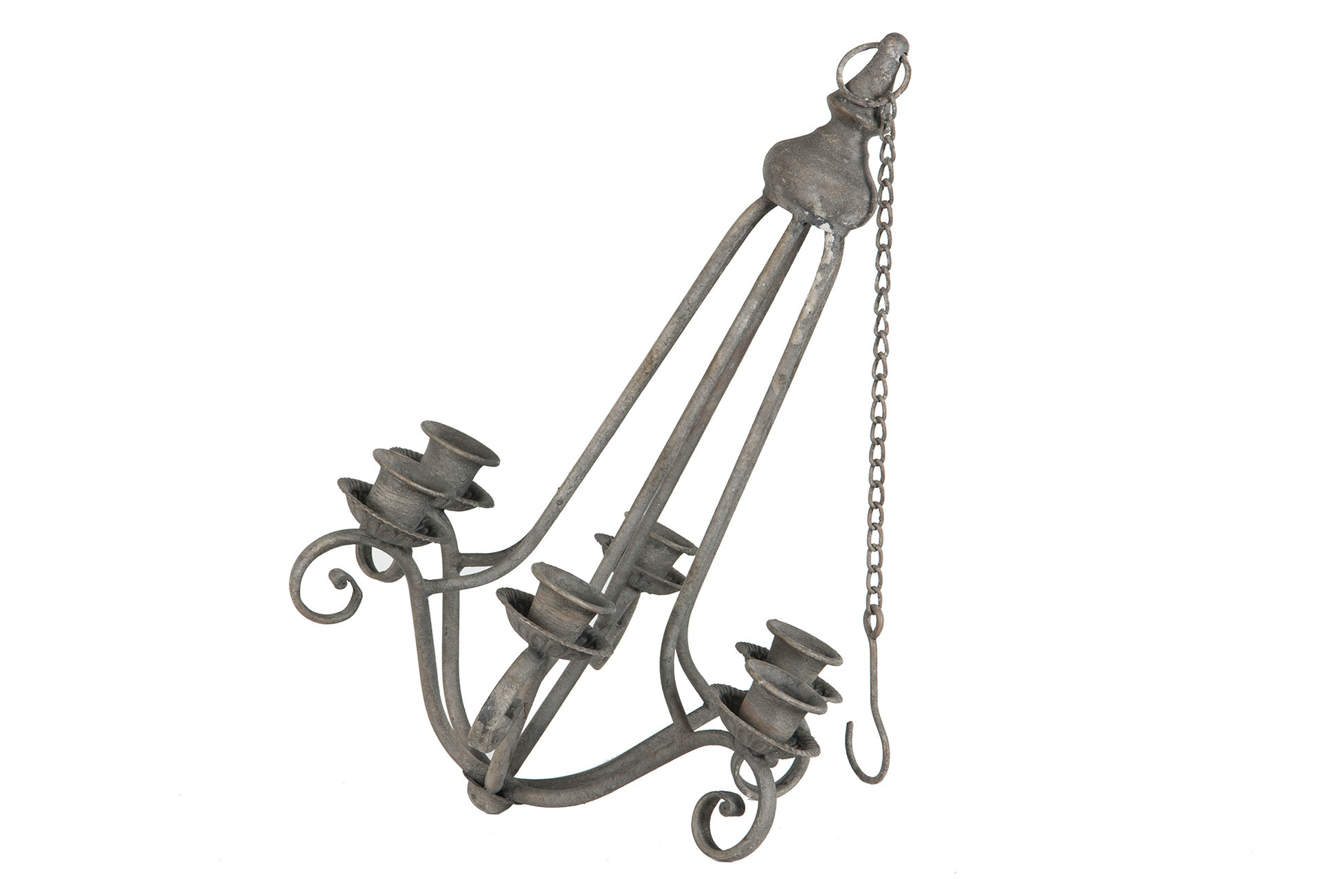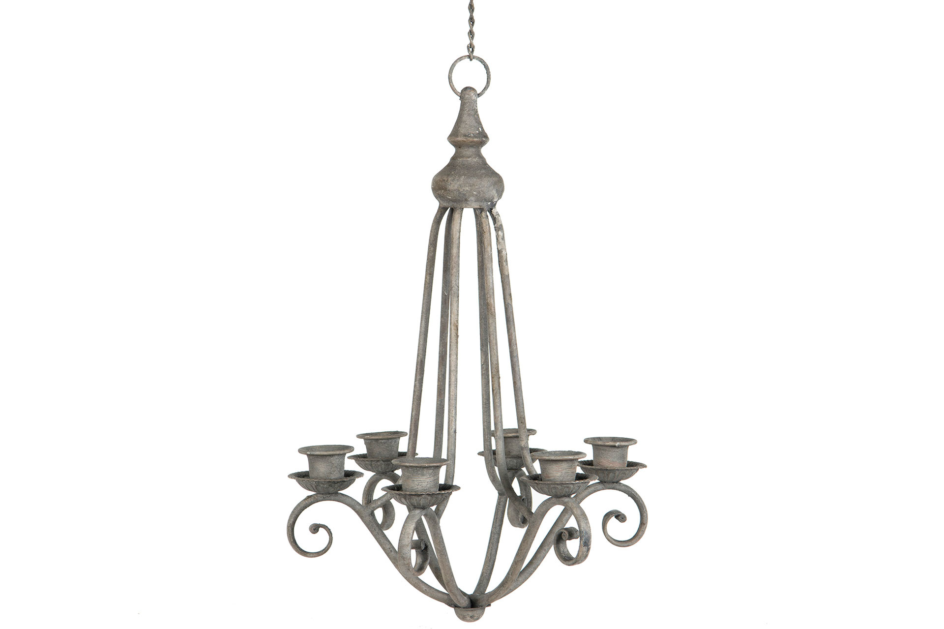 Vacker och dekorativ ljuskrona / takkrona i grå metall med fina detaljer. Plats för sex stycken kronljus.