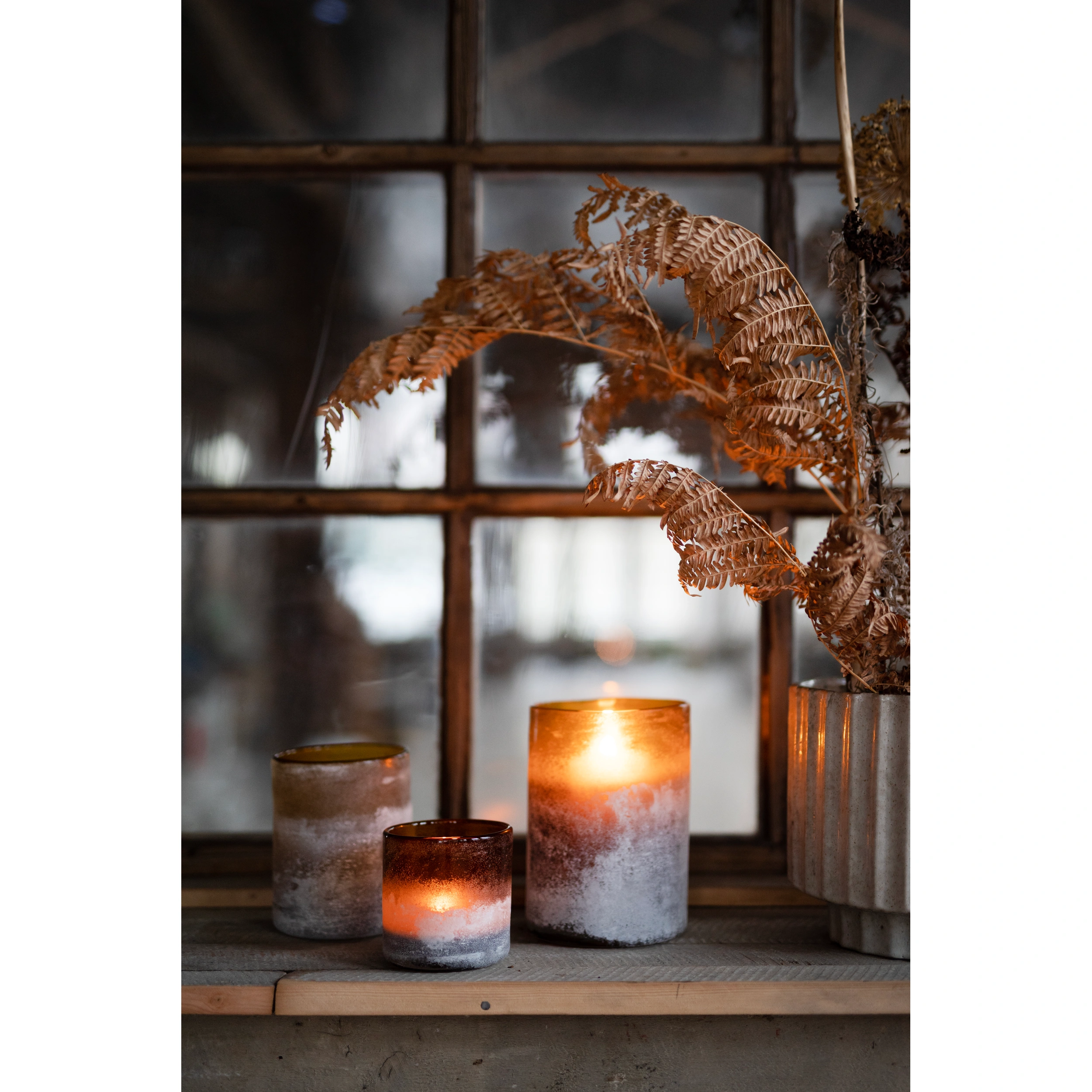 Mysig ljuslykta i frostat glas.
