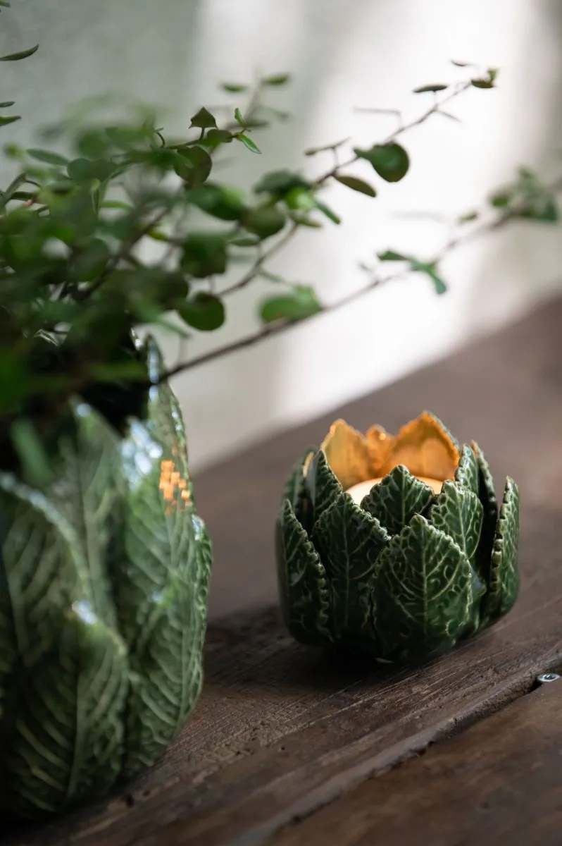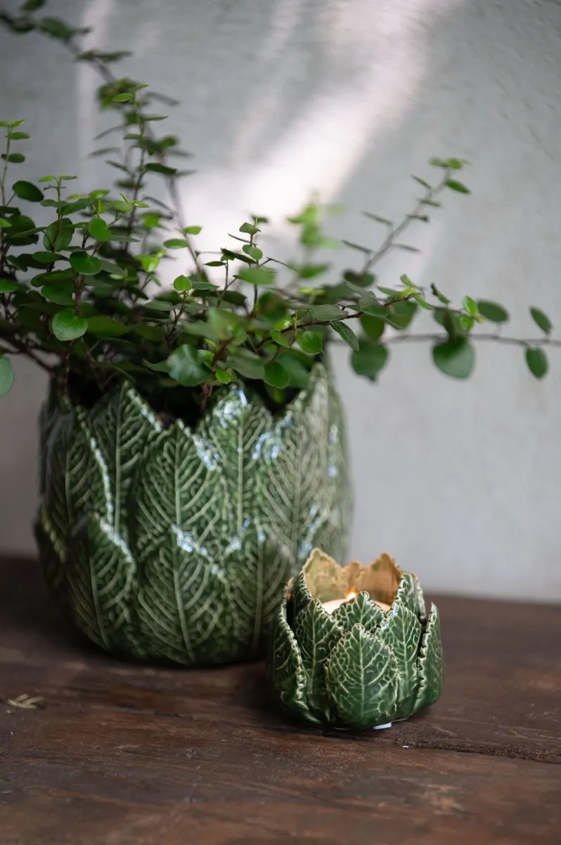 En stilren ljuslykta i glaserat stengods med gröna blad. Vi har även matchande krukor i samma serie.