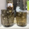 Mysig ljuslykta i frostat glas med motivet av snöflingor och träd.
