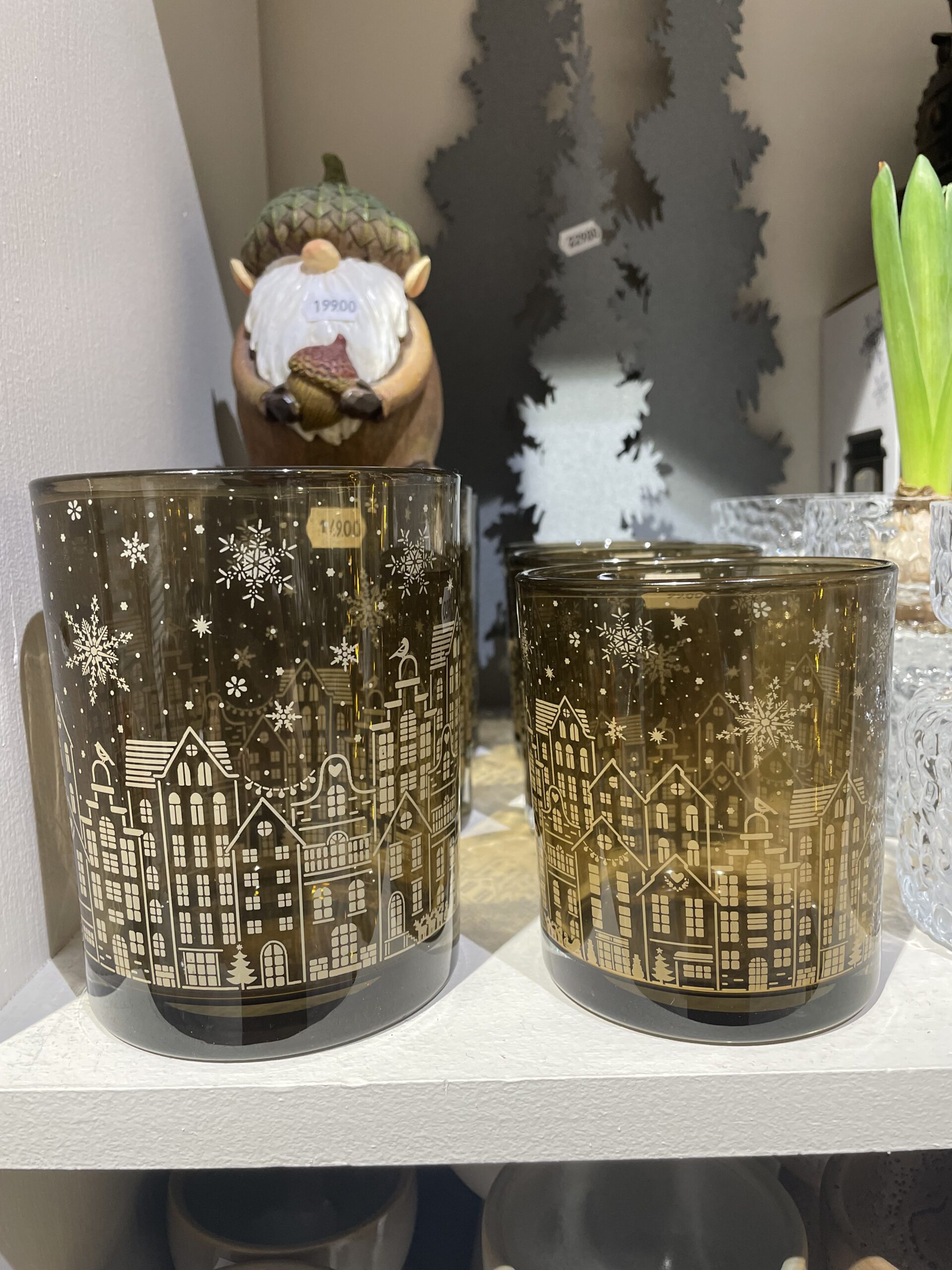 Mysig ljuslykta i brunt glas med motivet av hus och snöflingor.