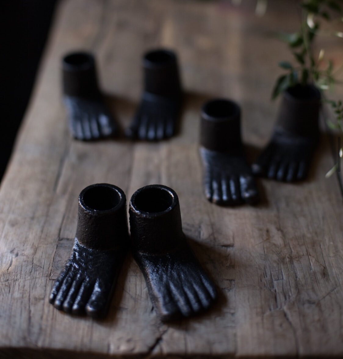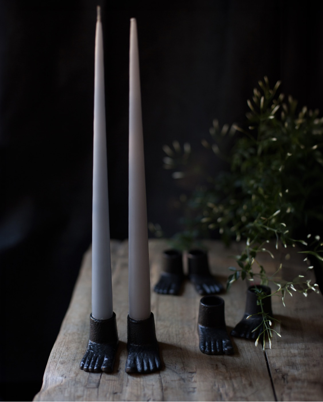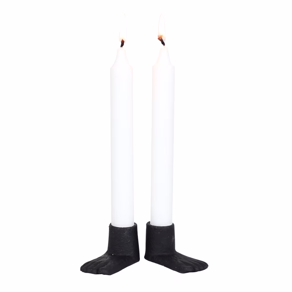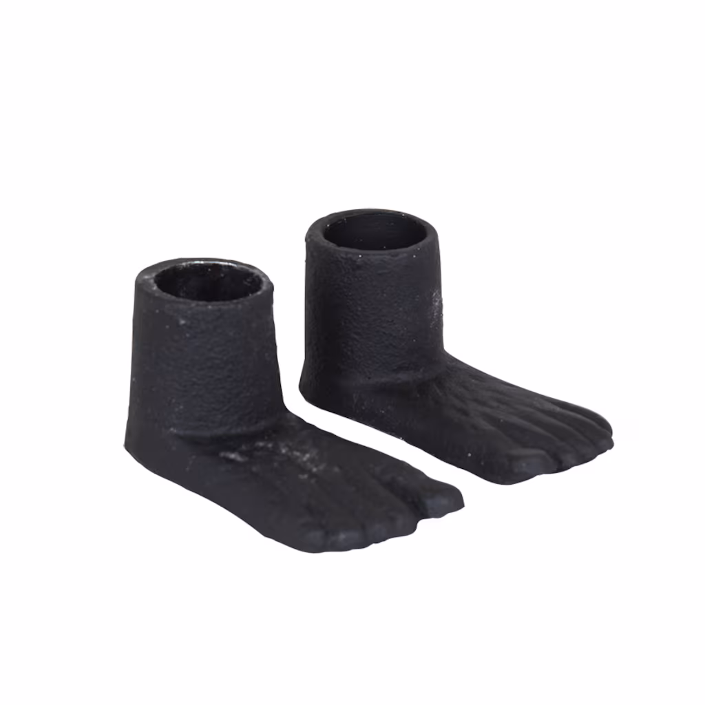 Söta ljusstakar i form av fötter i svart järn. Säljs i par om 2 stycken. Passar kronljus.