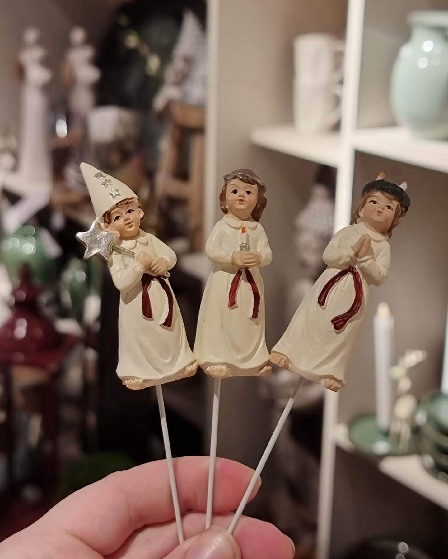 Sött luciatåg på pinne i form av självaste lucia, en tärna och stjärngosse. Perfekt att dekorera med i jul, sticka ner i en blomkruka eller annan plantering. Fin gammaldags lantlig julkänsla.
