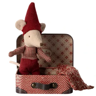 Söt julmus från Maileg, en baby som sover i sin resväska tillsammans med sin filt, musen har en röd mössa på huvudet.