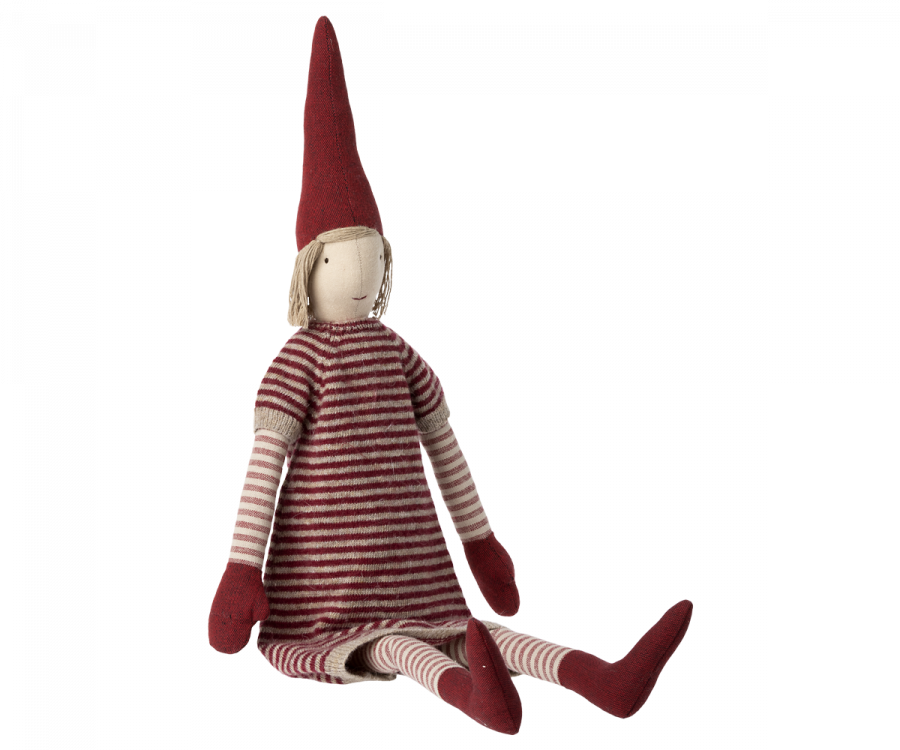En alldeles underbar Maileg Maxi Pixy Size 4 flicka i sin randiga klänning.