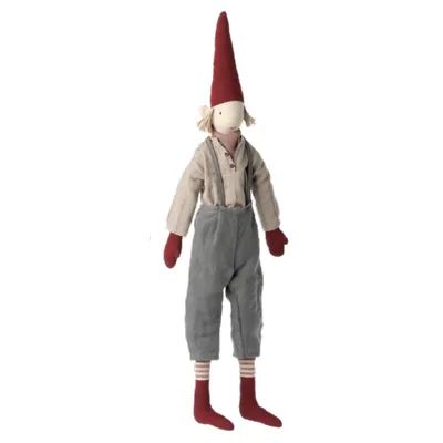 En alldeles underbar Maileg Maxi Pixy Size 4 pojke med sina fina kläder och hängslen.