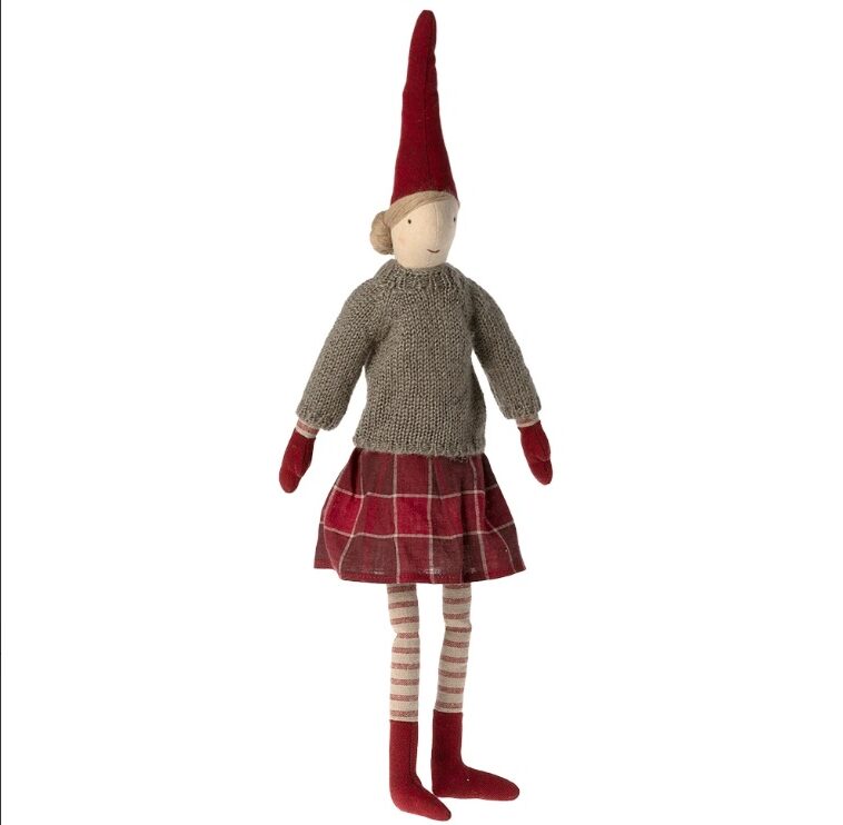 En alldeles underbar Maileg Medium Pixy Size 3 flicka med sin stickade tröja och rutiga kjol.