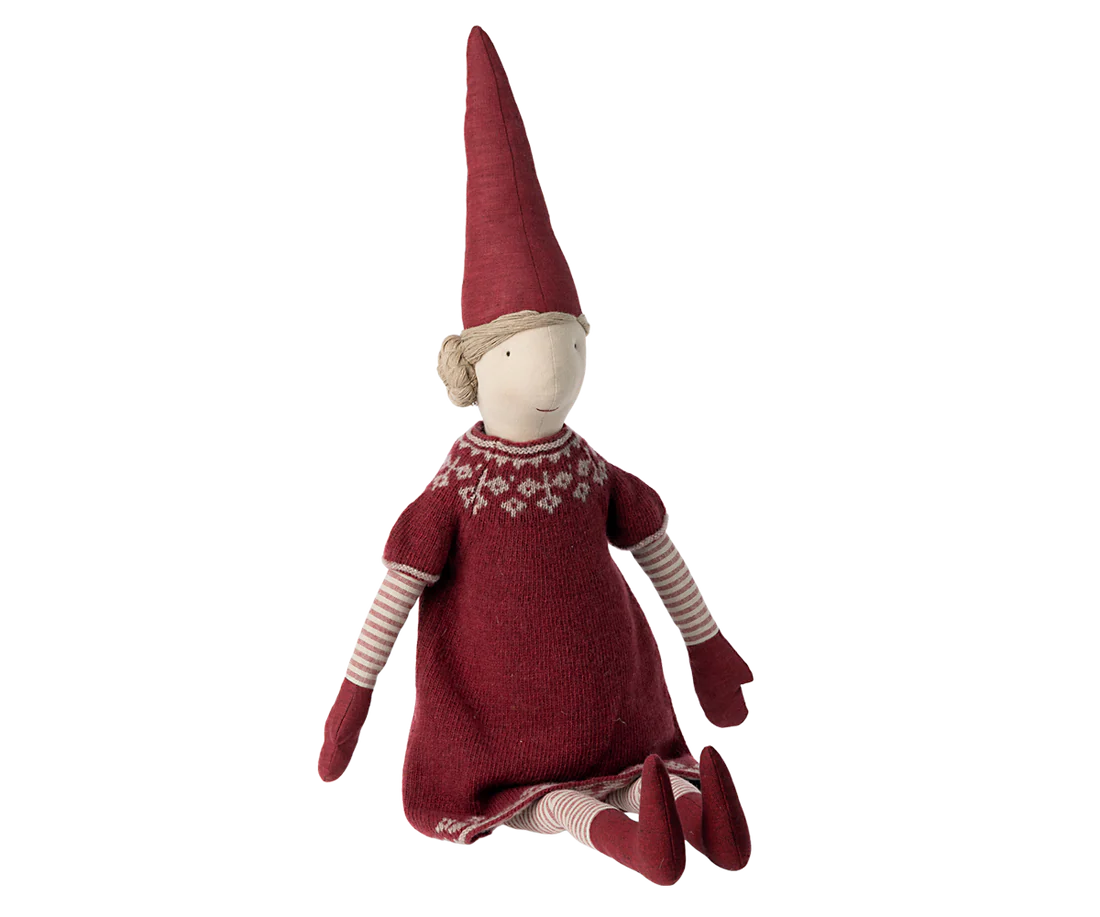 Maileg tomtemor santas wife på hela 83 cm. En alldeles underbar juldekoration som garanterat skapar ett blickfång vart du än placerar henne. Hon bär en vacker stickad klänning av lammull och en röd tomteluva på huvudet. Tillsammans med tomtefar skapar dem en stämningsfull jul i ditt hem.
