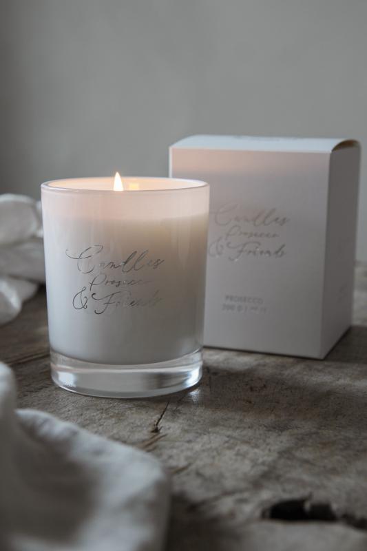 Vitt doftljus med texten “Candles, prosecco & friends” från Majas Cottage inkl. gåvobox. Ljuvlig doft av prosecco. Blyfri med bomullsveke. Säljs med förmån till Barncancerfonden