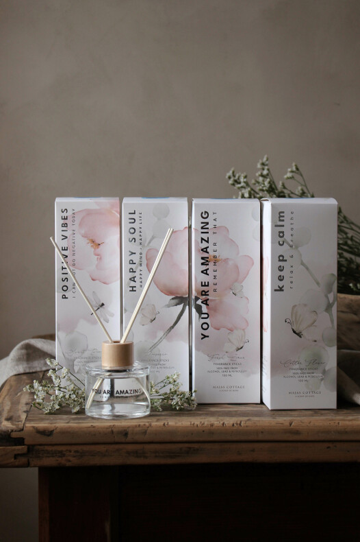 Majas Cottage doftpinnar i trä med glasflaska i en stilren design. Doftpinnarna kommer i fin presentförpackning. Säljs med förmån till Barncancerfonden